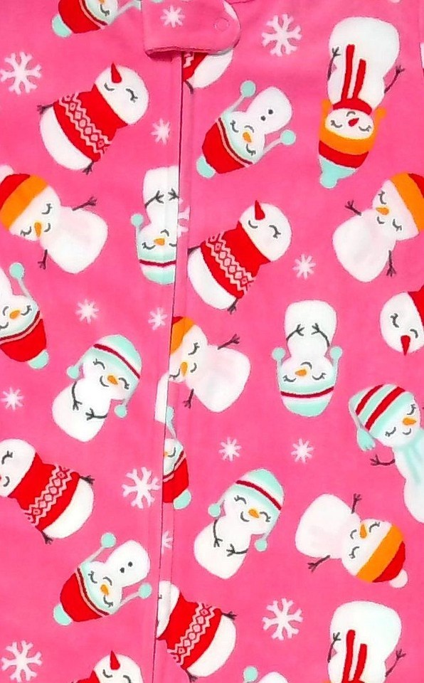 Of an ultra soft, warm and cozy fleece fabric, inside and out. A pretty bright pink with a super cute snowman print throughout. Full front zipper, zipper snap tab cover Non-slip textured foot soles. 100% Polyester