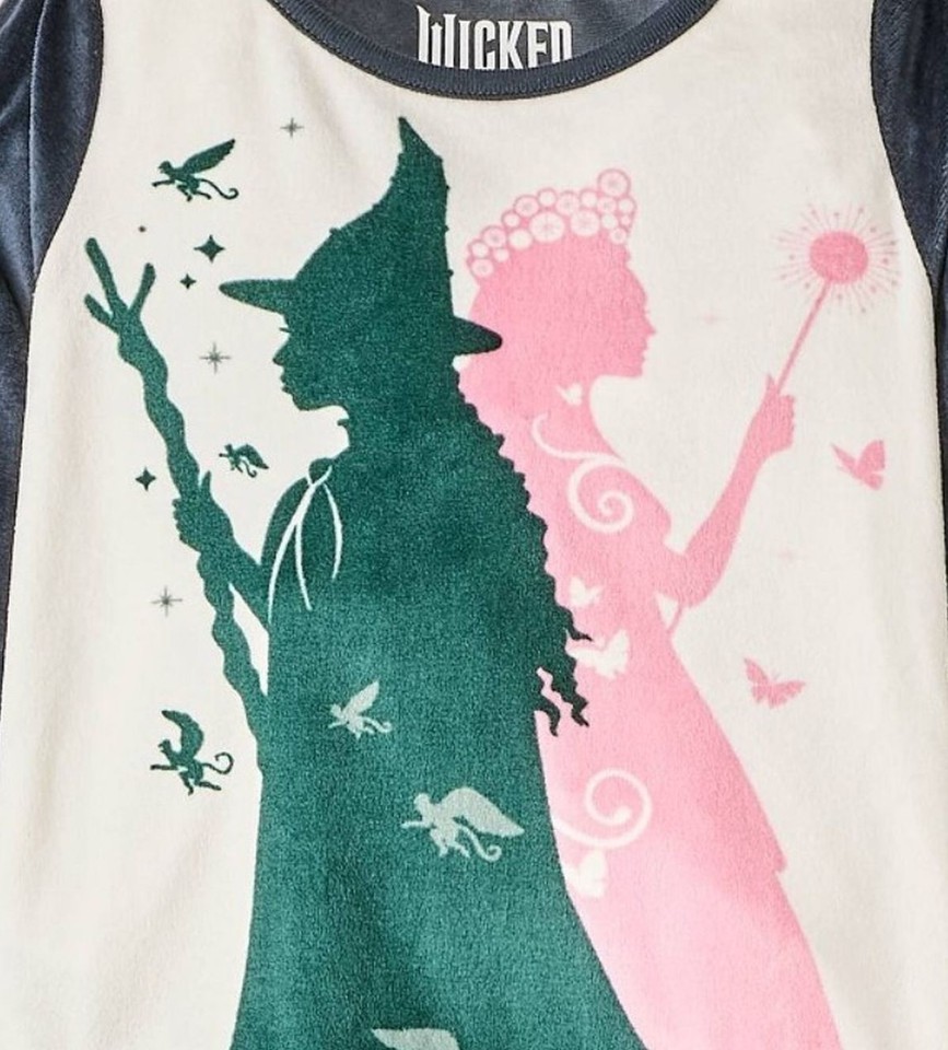 She can enjoy her fandom for Wicked in cozy comfort and style with this two-piece pajama set.The set includes a long-sleeve sleep shirt, pajama pants, and fuzzy socks, all crafted from super soft brushed fleece for exceptional warmth and softness. The pajama top features a pink and green graphic of Glinda and Elphaba, while the PJ pants showcase an all-over print of butterflies, flying monkeys, and other Wicked-themed designs against a gray backdrop. The coordinating fuzzy socks are solid pink on one foot and solid green on the other, complete with soft grippers on the soles for added comfort. Made of 100% polyester.