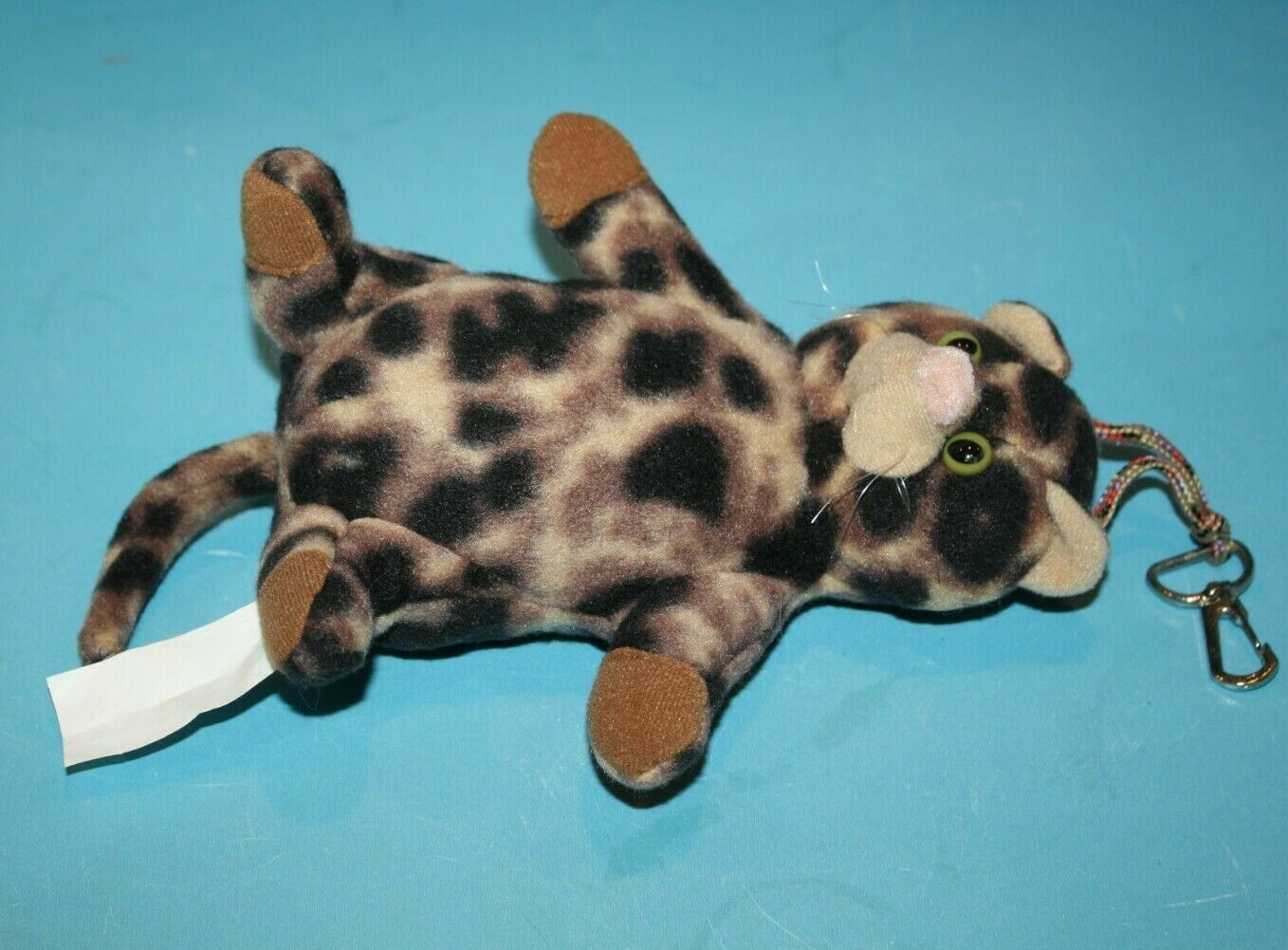 Features: Very soft fleece leopard animal print material, Plastic eyes and whiskers, Pink Plush nose, string hanging cord with metal clip to hook as desired