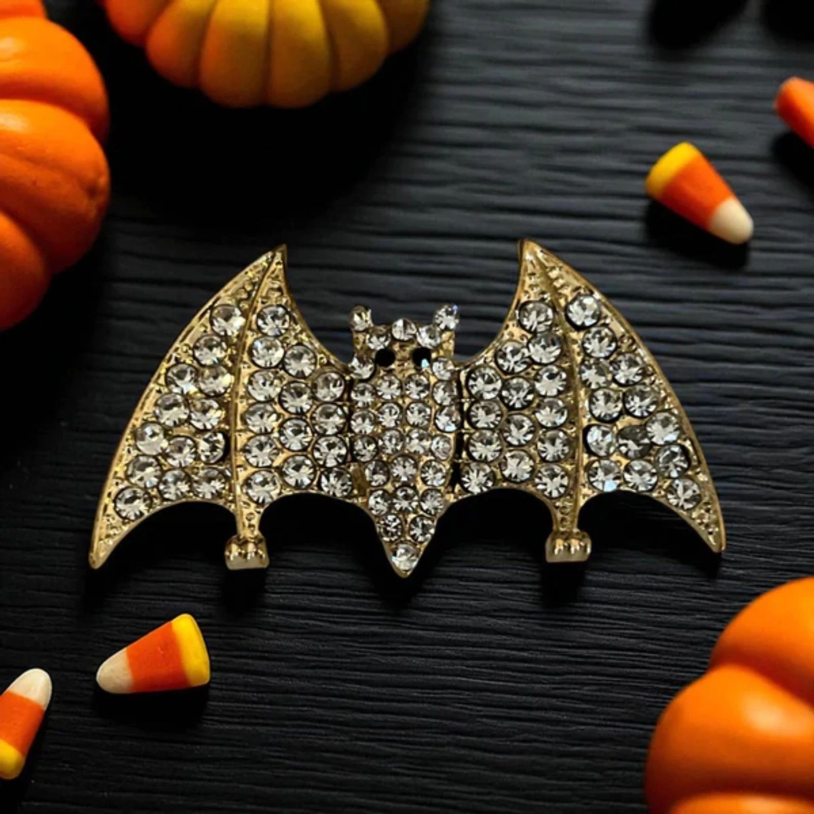This Halloween pin or brooch is a unique and eye-catching accessory that is sure to make a statement. The pin features a flying bat design that is adorned with rhinestones, adding a touch of glamour and sparkle to the overall look.