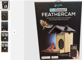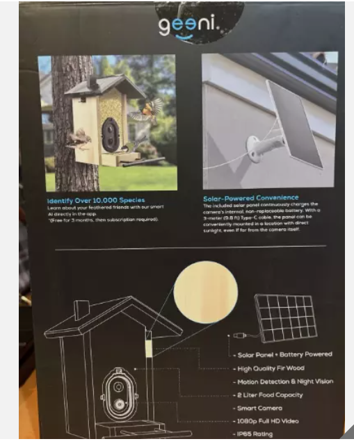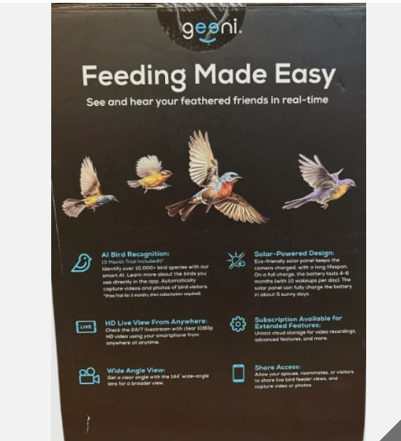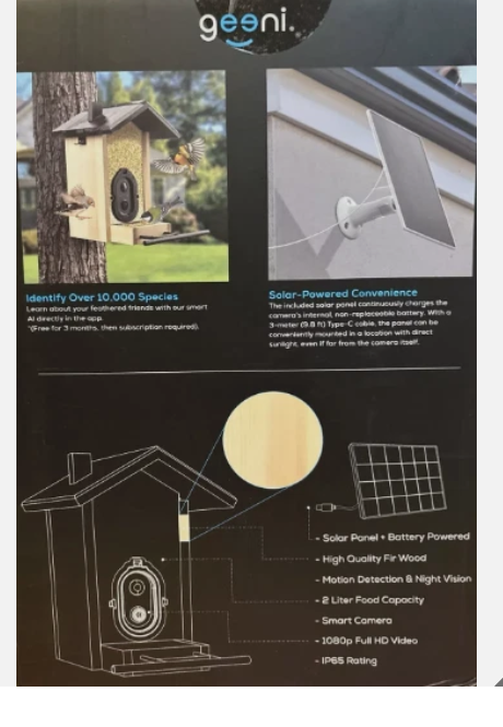 This is a New item in the box never opened never used. This is a geeni bird connect feather cam smart birdfeeder with camera and AI bird identification. Works with Google home and works with Alexa. Watch and identify over 10,000 bird species with smart AI directly in the app. It is solar powered design, HD live view from anywhere, wide angle view,