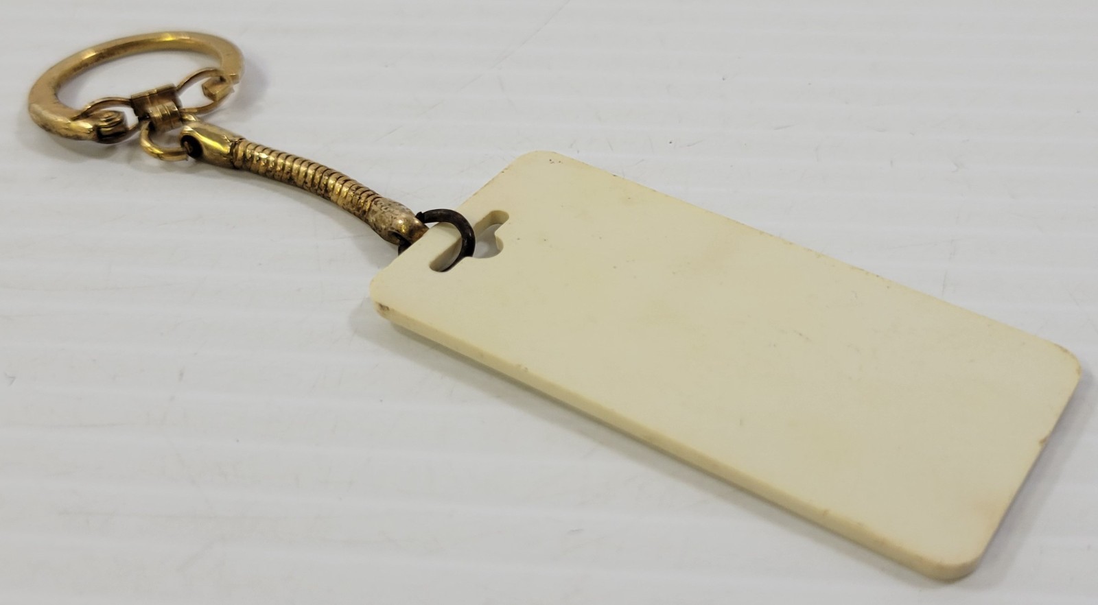Plastic keychain measures about 2-3/8" x 1-1/8"