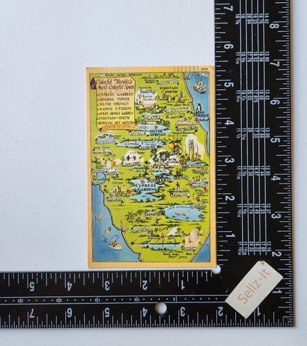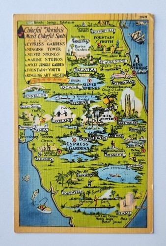 Vintage Divided Back Linen Postcard Featuring a Map of Florida's Most Colorful Spots a Map with Points of Interest Including Cypress Gardens, Singing Tower, Silver Springs, Marine Studios McKee Jungle Garden, Fountain of Youth and Ringling Art Museum.