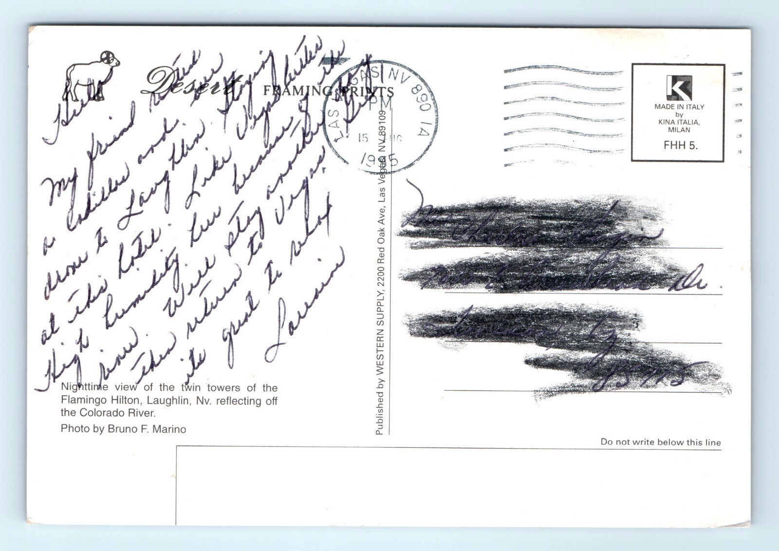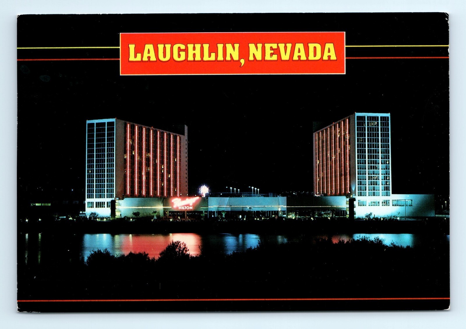 Vintage Divided Back Postcard Depicting the Nighttime View of the Twin Towers of the Flaming Hilton Located in Laughlin Nevada Reflecting Off the Colorado River.