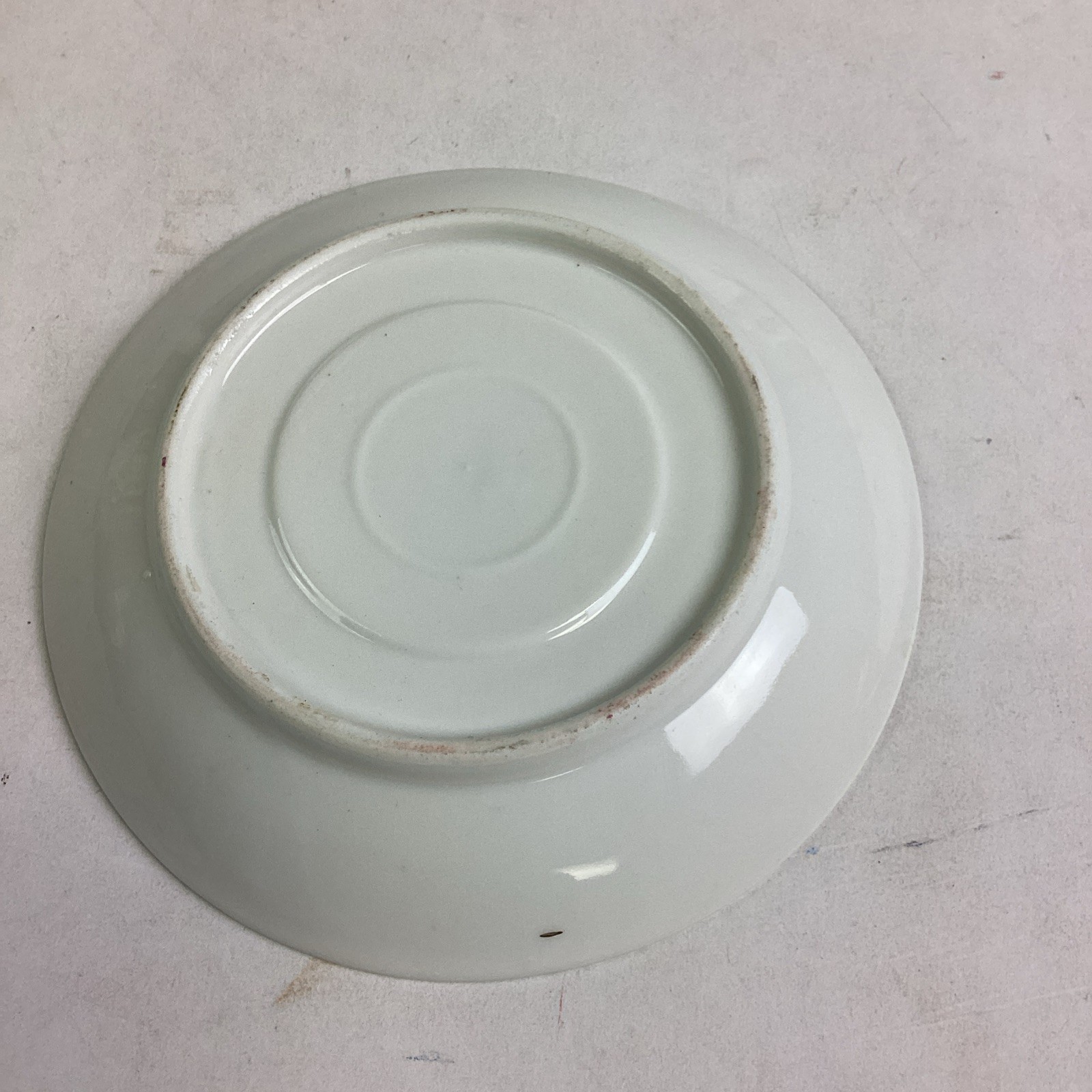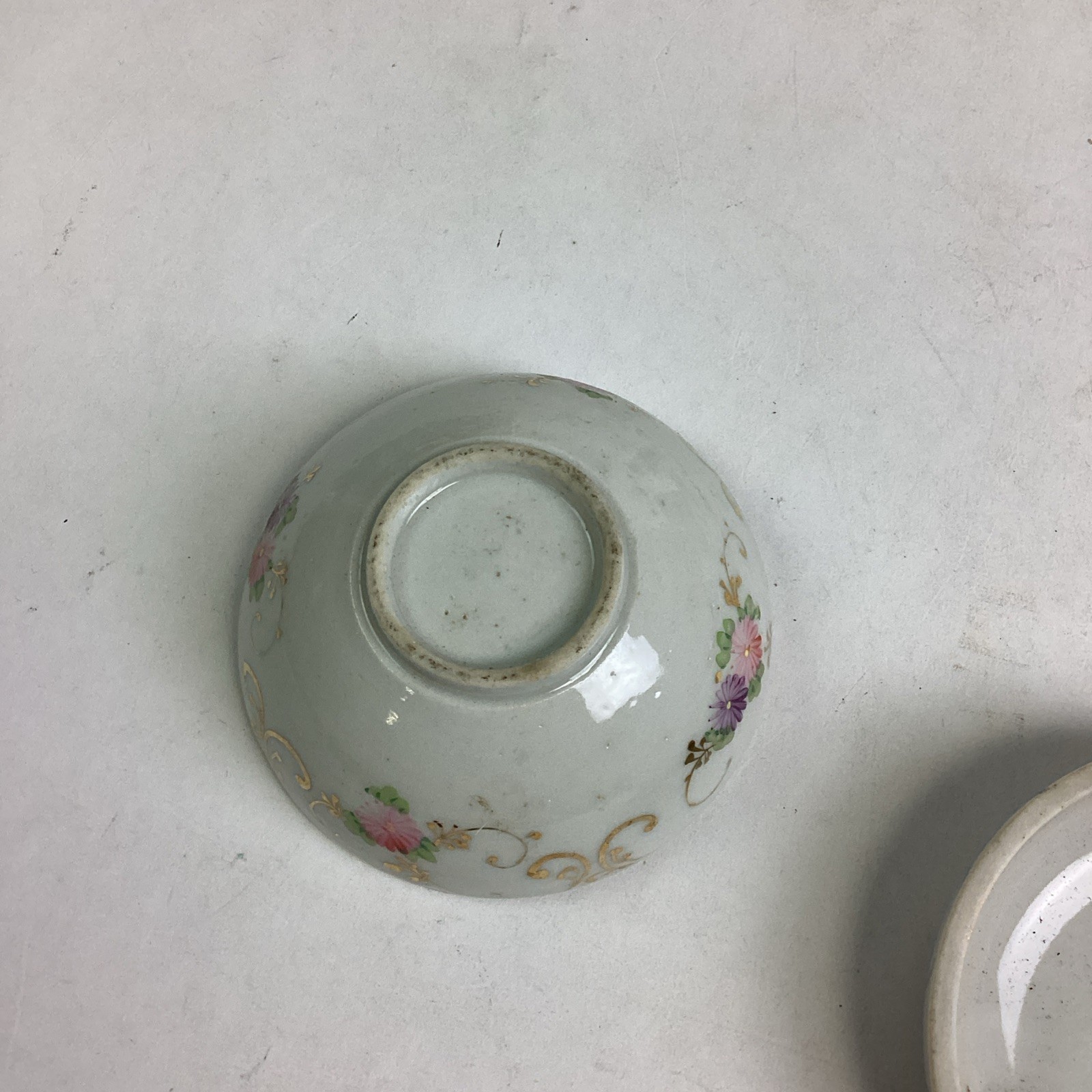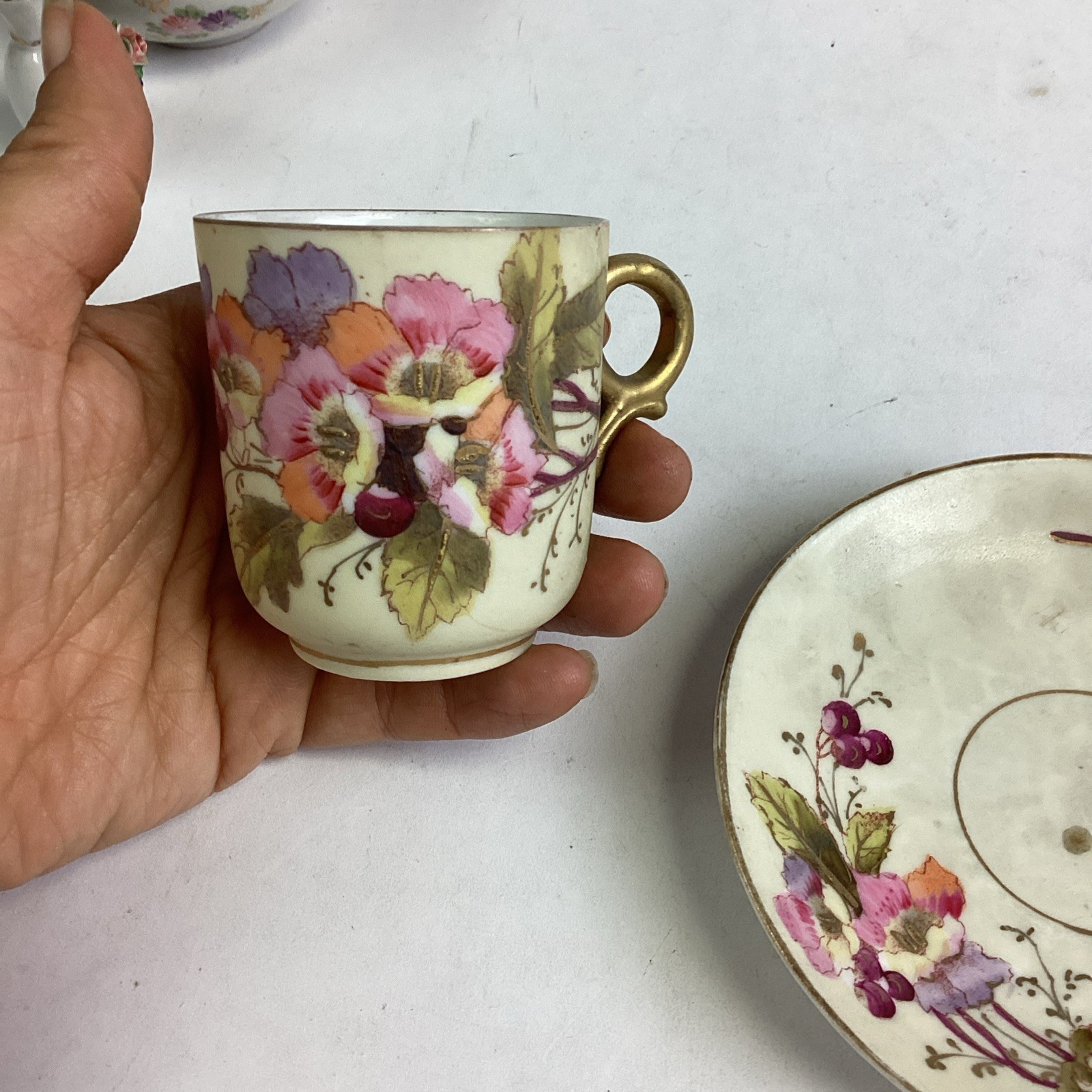 3. Cup and Saucer - one with pink and purple flowers. Has some paint loss. The cup has a chip on the top edge. The cup measures 2 1/8?Dx2 3/8?D. The saucer is 4.5?D