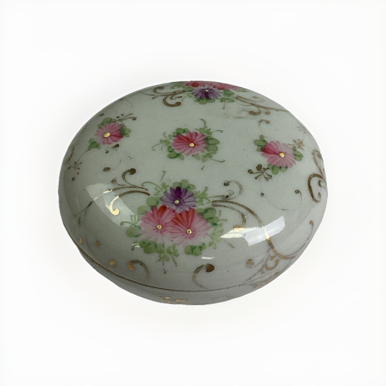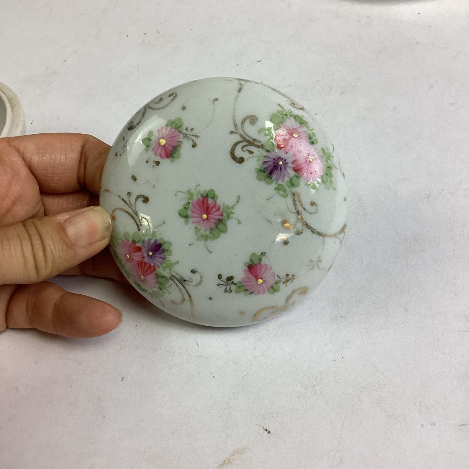 1. Lidded trinket box - has some pock marks and some paint loss. Measures 3.5?Dx2?H