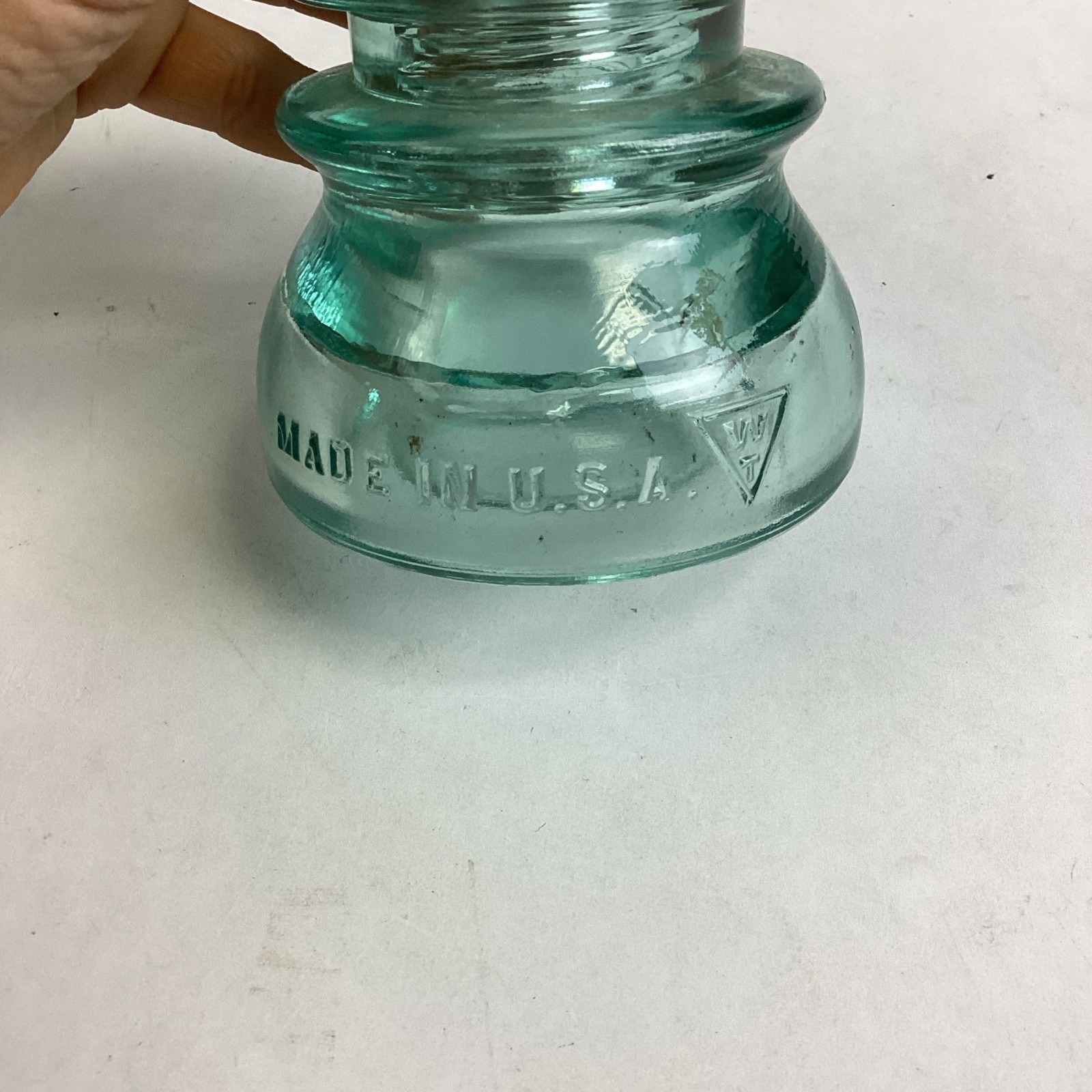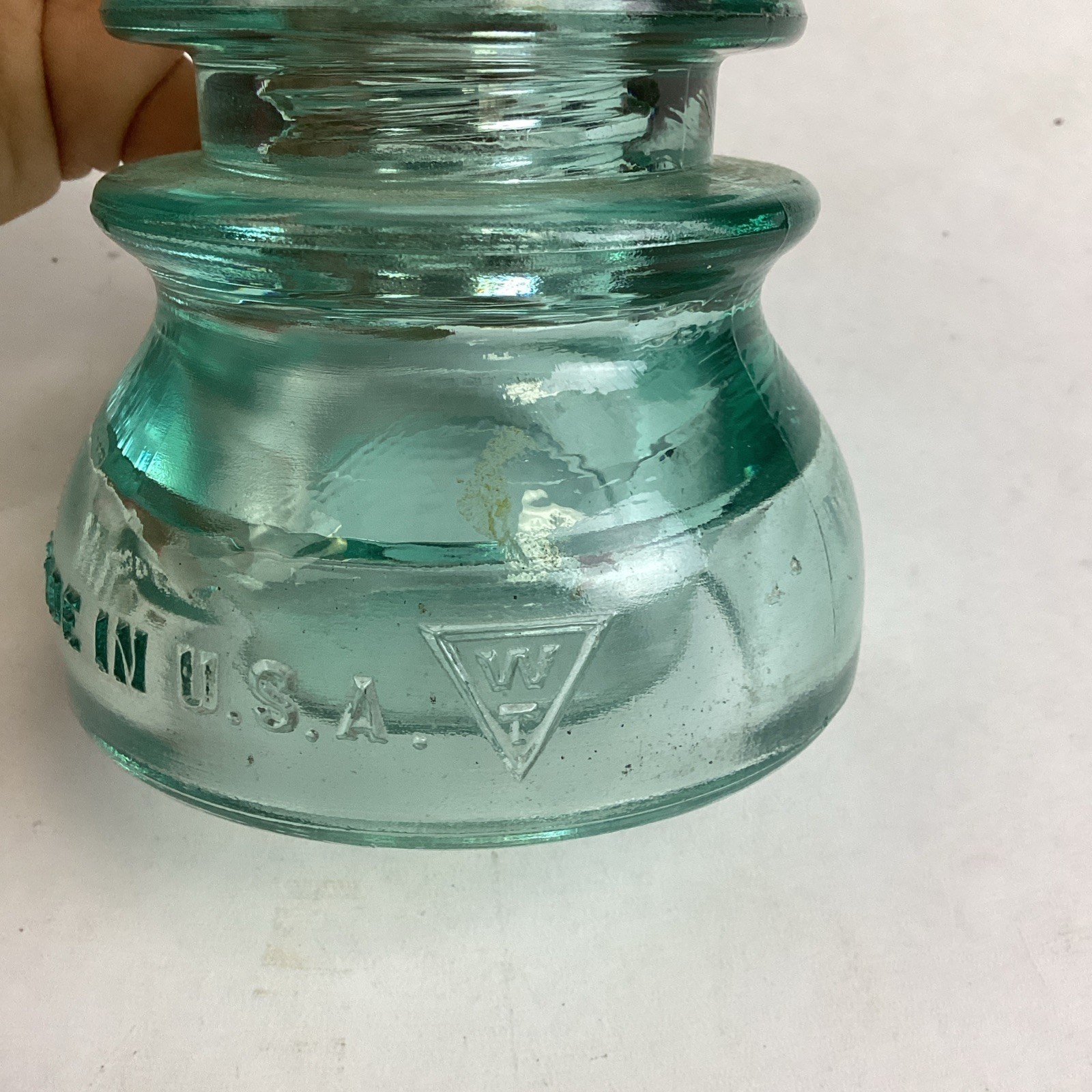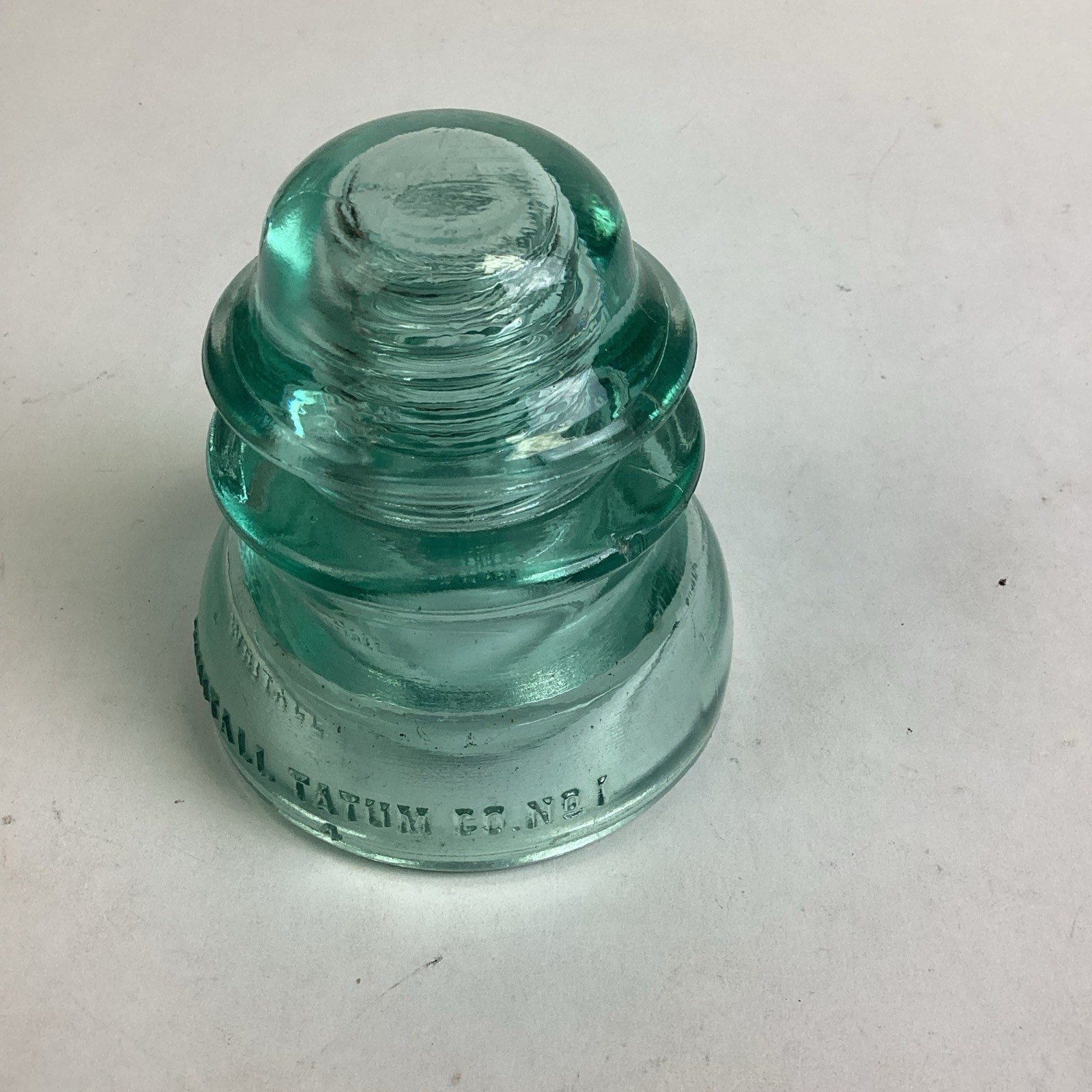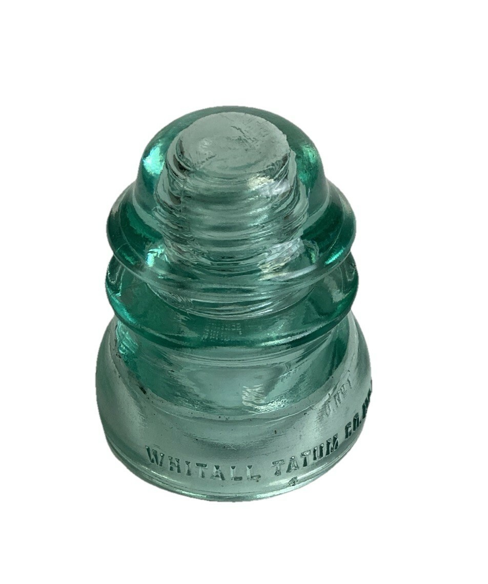 Antique WHITALL TATUM Co. #1 - Railroad Telegraph Line Insulator - Aqua Green. In good condition overall. No cracks or chips in the glass but there are some stains. This measures 4?Hx3.5?D