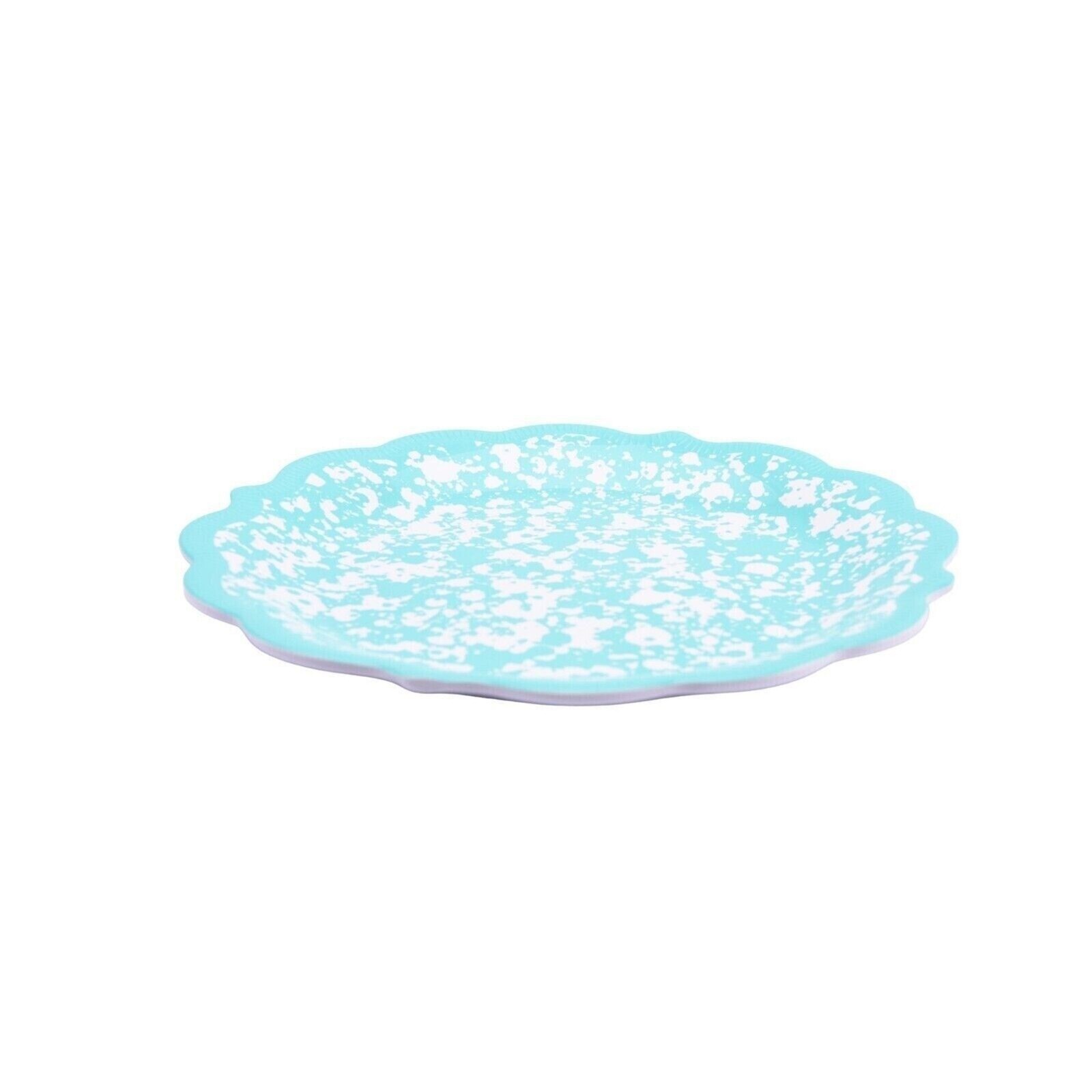 This 10.7-inch teal blue and white plate, made of durable melamine, flaunts a unique country-style splatter pattern. It's BPA-free for safe use.