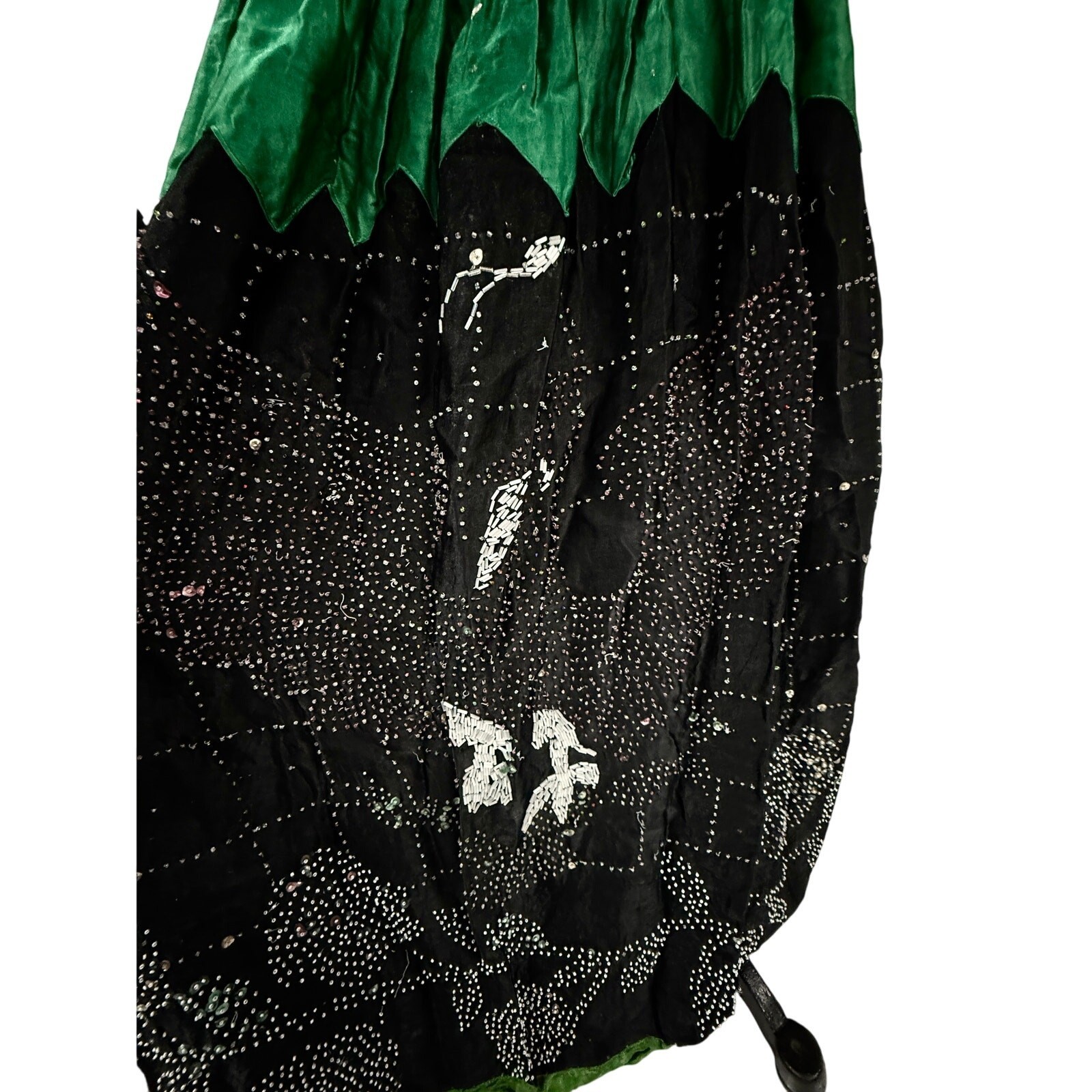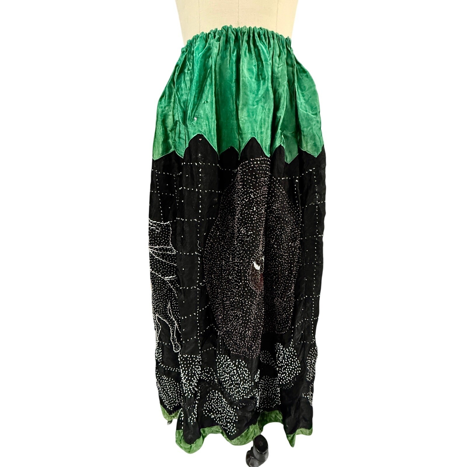 This is an extraordinary and truly unique piece of wearable art, a vintage beaded skirt with a fascinating history. Found in a recent Pennsylvania estate, this skirt appears to be a 1920s upcycled creation, where an intricate, older beaded textile was repurposed into a skirt during the flapper era. The craftsmanship of the beadwork is remarkable, contrasting with the more homespun finish of its 1920s construction.