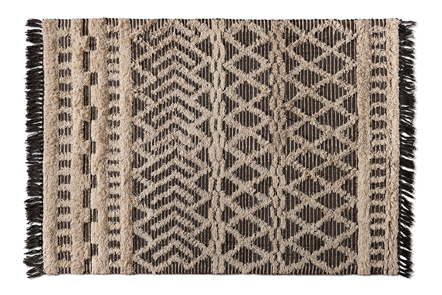 Bolster the interior of your home with the astonishing design of the Sora rug. Handwoven in India, this rug is comprised of wool. A stunning geometric design adorns the Sora with eye-catching visuals that complement modern interiors. The masterful blend of ivory and charcoal colored threads create rich texture, while fringe on the ends adds contemporary elegance. With its stunning, dynamic design, the Sora rug is sure to leave an impression.