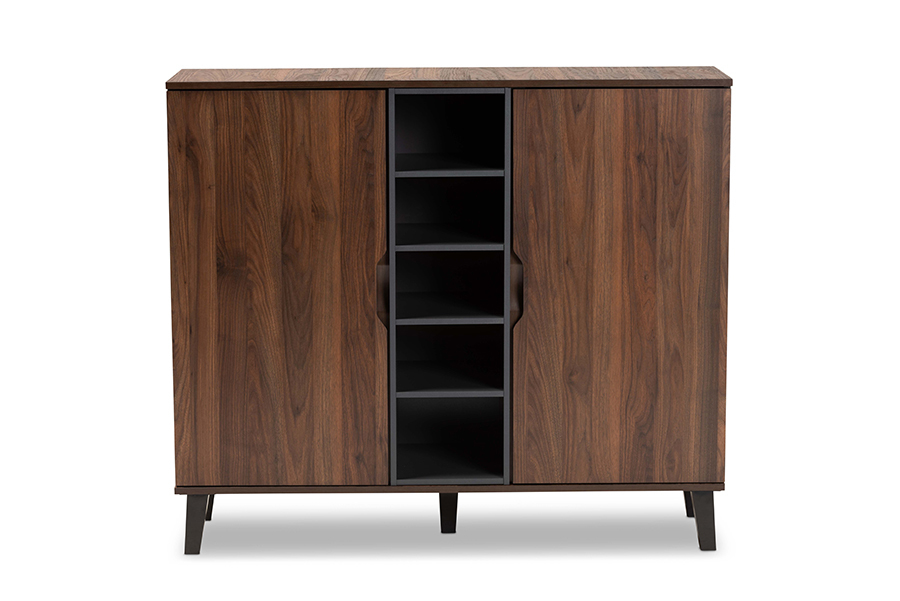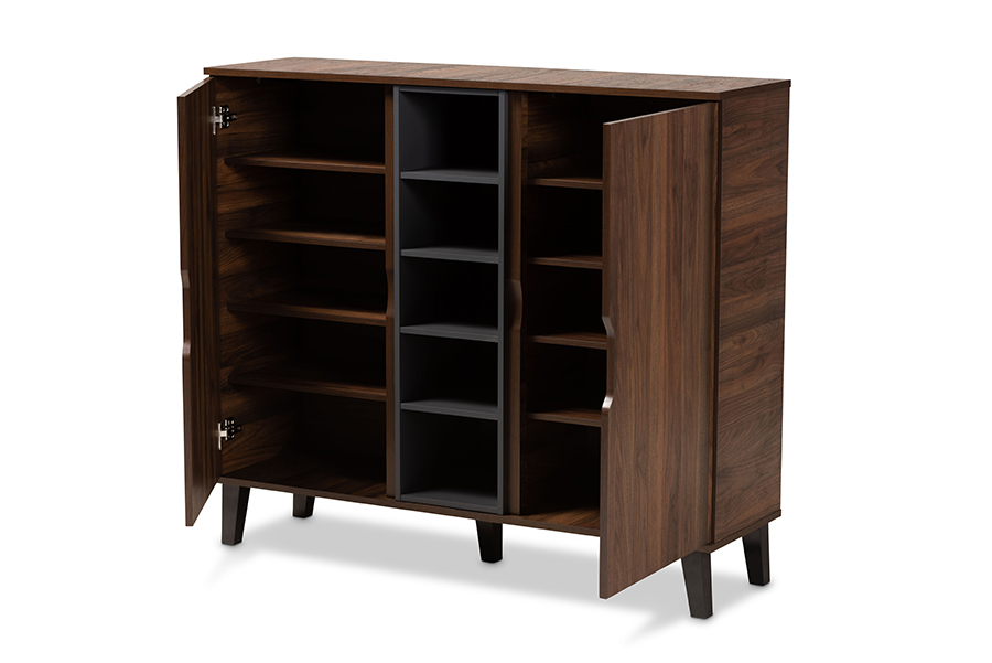 Easily organize your entryway with the generous shelving of the Emmali shoe cabinet. Made in Malaysia, the Emmali is constructed from sturdy wood in a sleek, modern two-tone walnut brown and Grayfinish. Five open shelves and ten enclosed shelves provide ample space to store up to 25 pairs of shoes. Dark brown splayed legs add a touch of retro charm, while cut-out handles lend a contemporary look. Requiring assembly, the Emmali shoe cabinet is the prime choice for displaying the finest shoe collections.