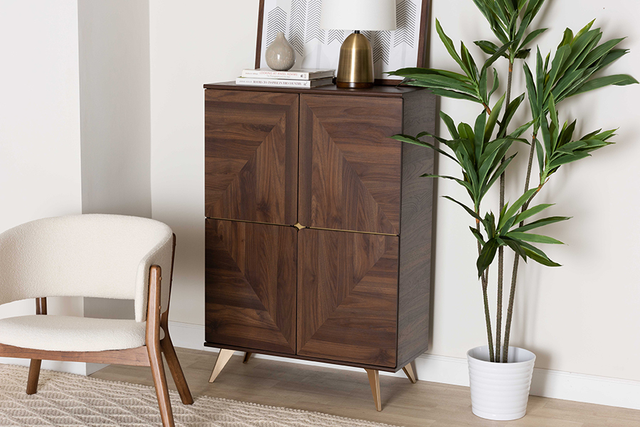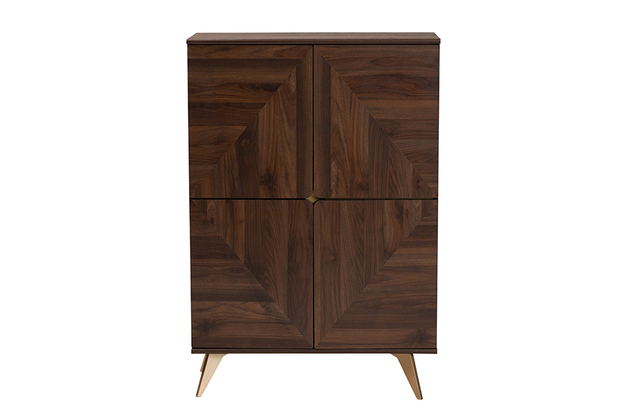 Features: Constructed from rubberwood, MDF wood, and LVL Walnut brown finish Six (6) interior shelves organize 18 pairs of shoes Angled plastic legs Handleless door design Geometric wood grain Set Includes: One (1) Shoe Cabinet