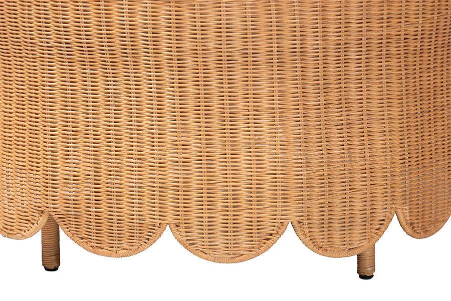 Features: Bohemian Ottoman Constructed from a Metal frame with Natural Rattan and Engineered Wood Scalloped rattan skirt exhibits soothing geometry from every angle Versatile use as a footstool or extra seat as needed Removable cushion padded with foam and upholstered in fabric Timeless Pieces That Elevate Any Spaces Set Includes: One (1) Ottoman