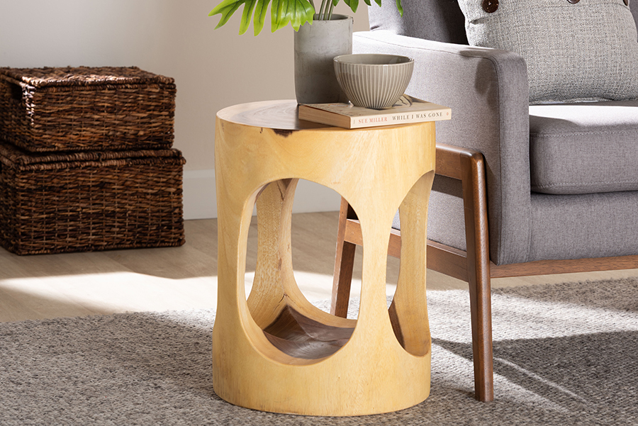 Features: Hand carved from suar wood, natural deviations in texture are unique across each piece Constructed from Suar Wood Openwork design showcases the unique internal and exterior texture of the piece Sleek cylinder silhouette with smooth curves and cutouts exudes chic geometric flair Round tabletop brings convenience to any living room or other shared space Arrives Fully Assembled Set Includes: One (1) End Table