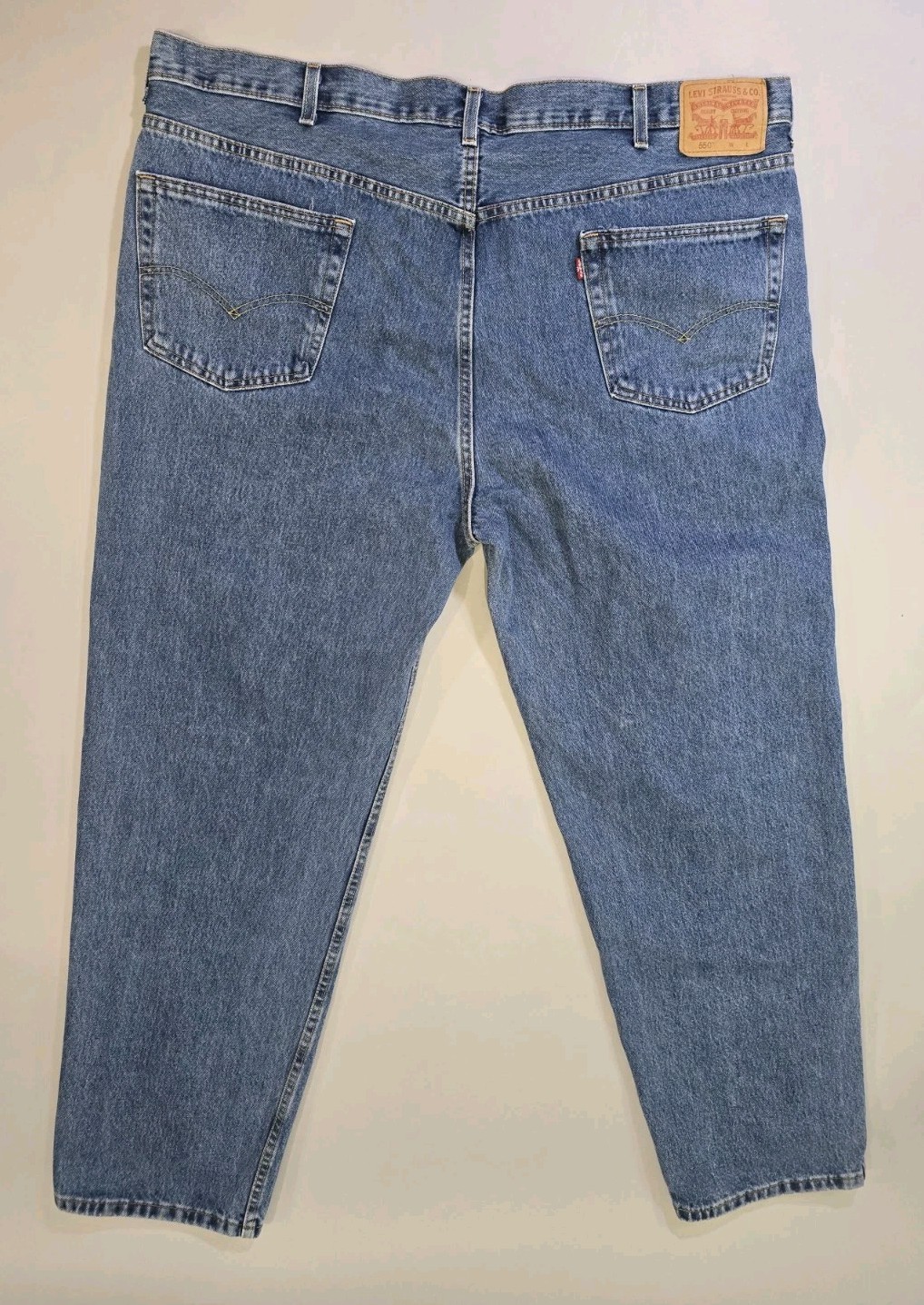 Please see all photos. One care tag on inside has been removed. The product is a pair of Vintage Levi's 550 Jeans for men, size 46x34, in a medium blue color. Made in Mexico from 100% cotton denim, these straight-cut jeans feature a classic light wash and are part of the Levi's 550 model. The design is reminiscent of the USA, making it a timeless and stylish addition to any man's wardrobe.