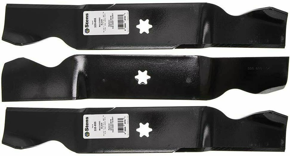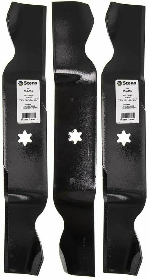 Pack of 3 Stens 335-855 Mulching Blades. Replaces OEM Cub Cadet / MTD 742-0677, 742-0677A, 742-0677B, 942-0677, 942-0677B, OCC-742-0677, OEM-742-0677. Length: 18-1/2" x Width: 3" x Thickness: 0.203" x Center Hole: 6 pt. star.