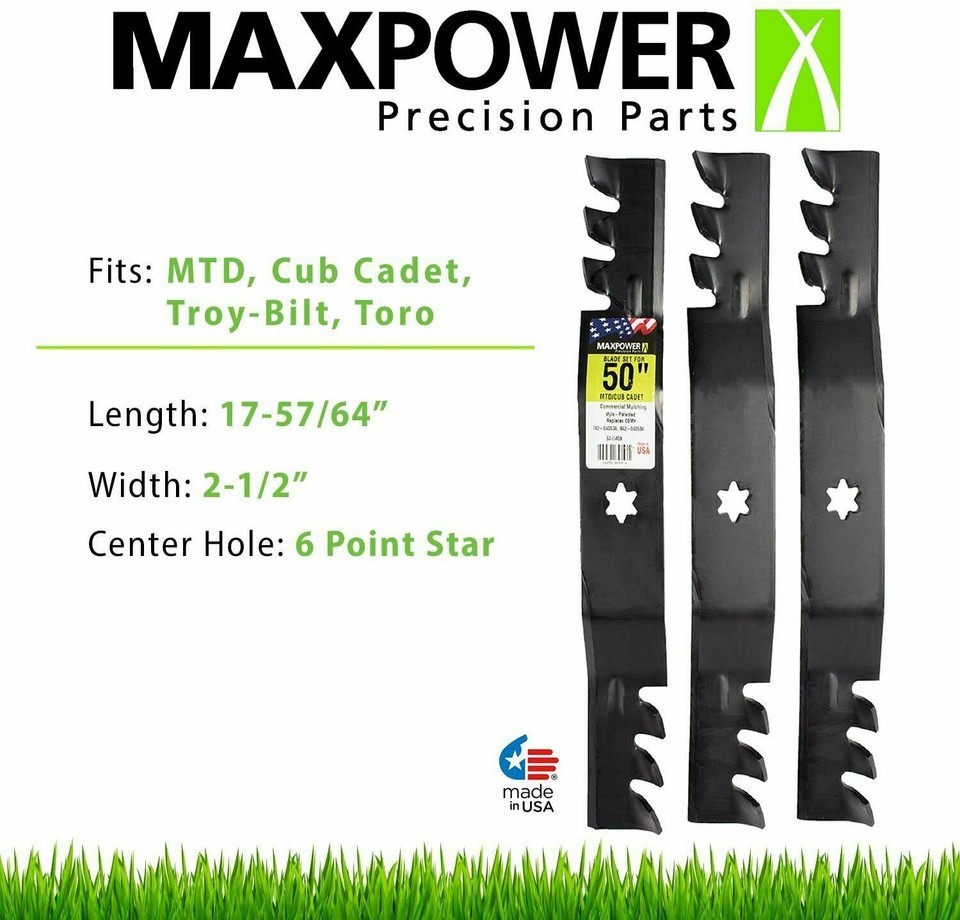 Includes 3 commercial mulching blades for many 50 in. cut MTD, Cub Cadet, and Troy-Bilt mowers