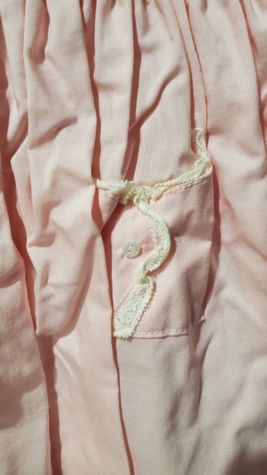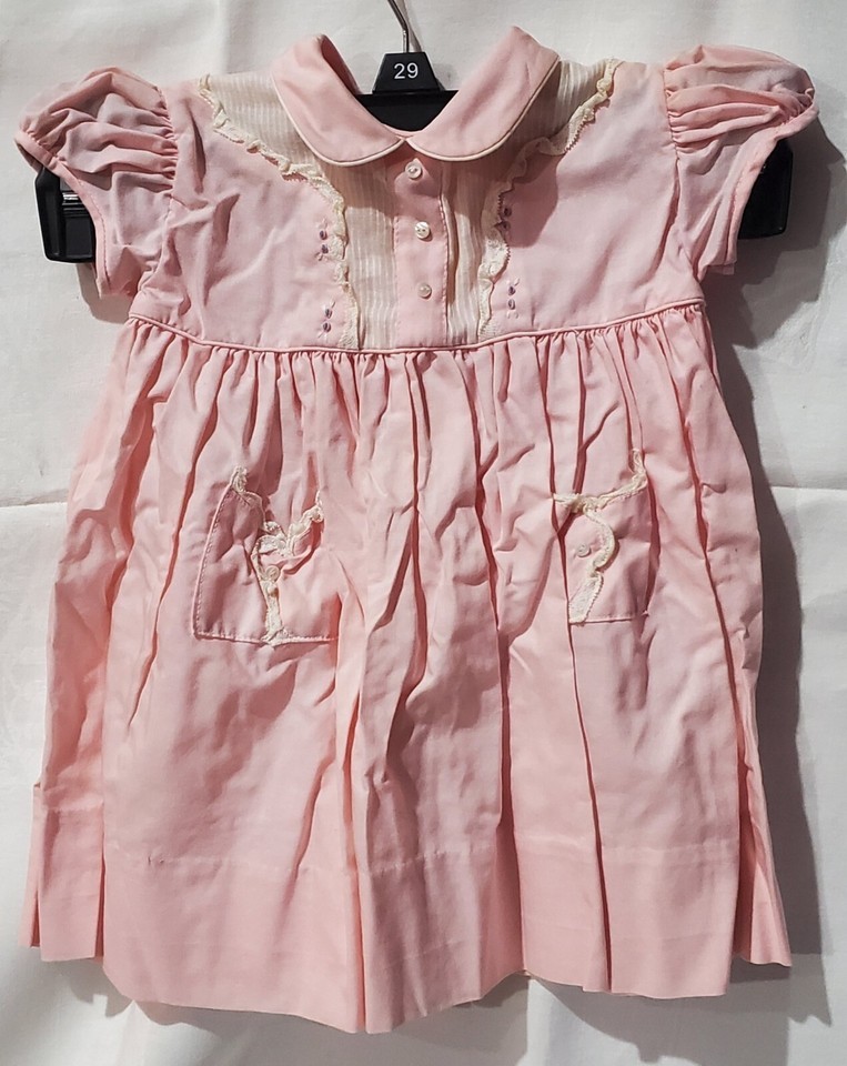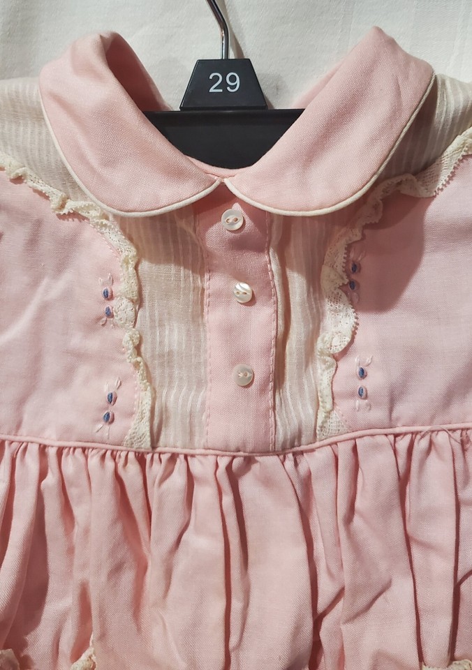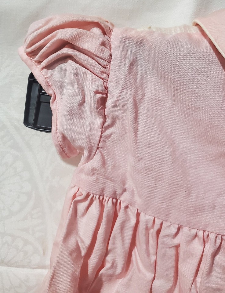 Vintage pink, lightweight baby Smock Dress. This has beautiful details. There are three functional buttons to close/unbutton the dress in the back. There are blue accents, two pockets, and three non-functional buttons on the front. There is no actual size or tag on the dress.