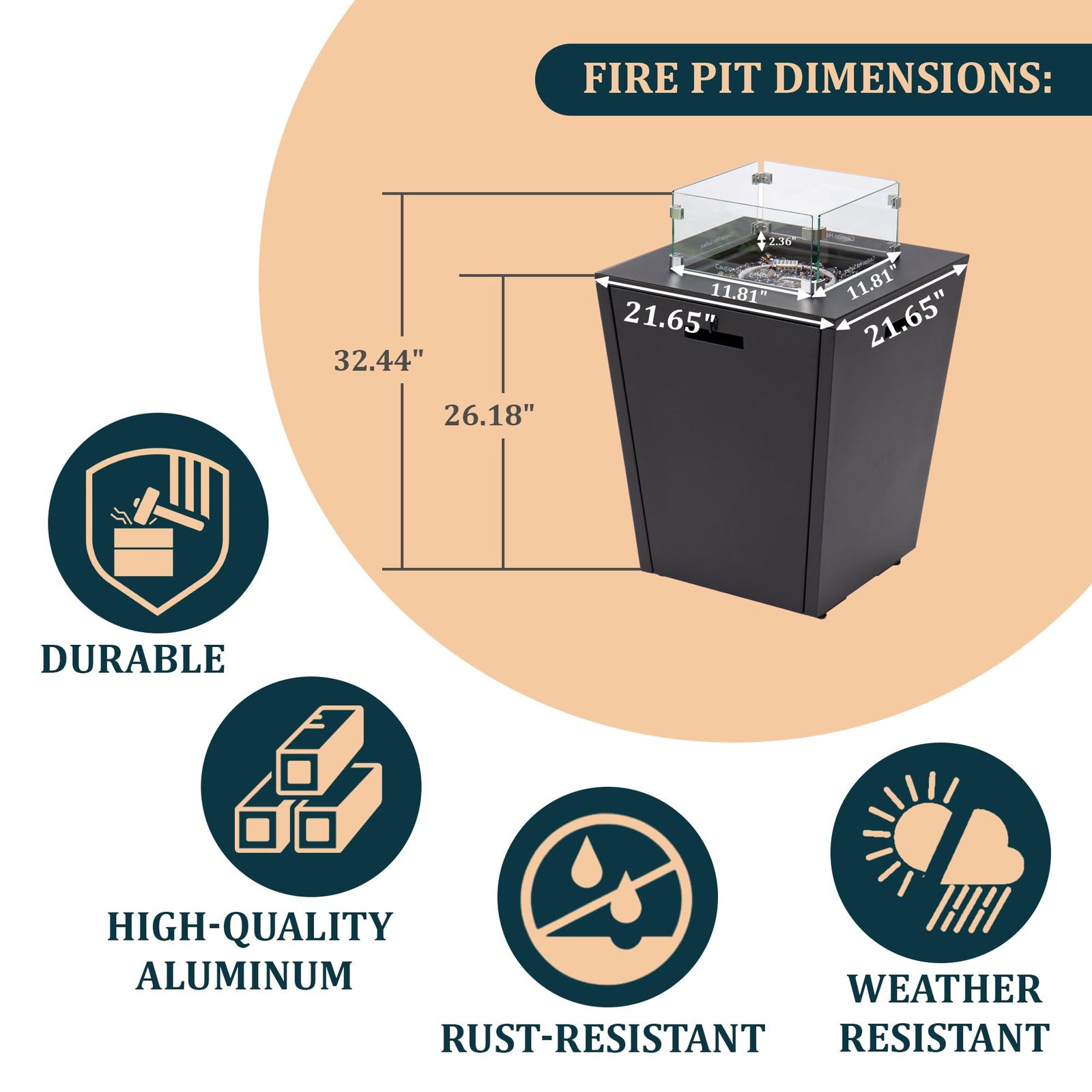 Bullet point: [POWDER-COATED FRAME] The modern chaise lounge chair and fire pit table are constructed with a durable aluminum frame with a powder-coated finish for extra strength and longevity. This ensures that the set can withstand the elements and resist rust and corrosion, making it suitable for outdoor use.