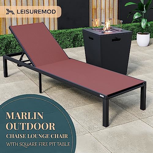 LeisureMod Modern Black Aluminum Outdoor Chaise Lounge Chair with Square Fire Pi