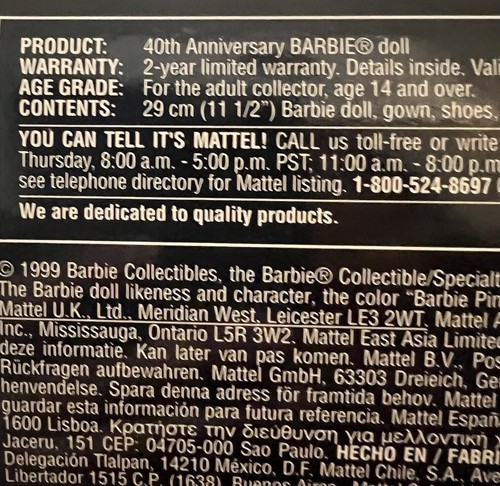 Mattel Collector Edition 40th Anniversary Barbie Doll 1999 # 21384~ NIB-
