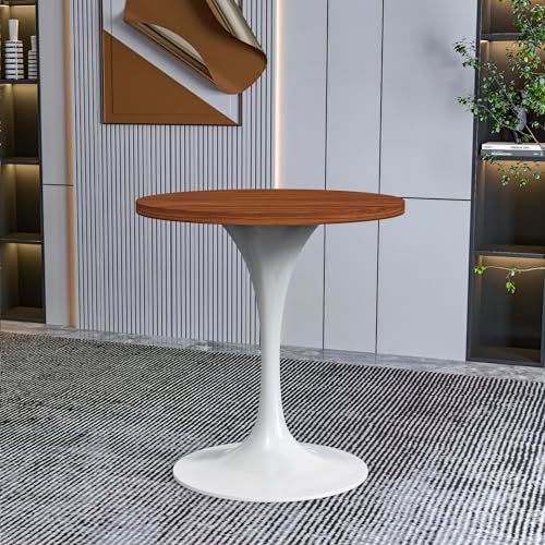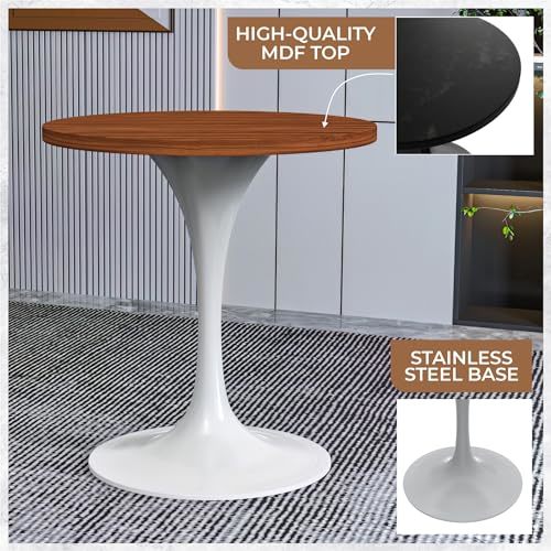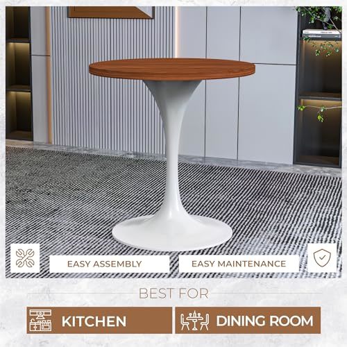 The central feature of the dining table revolves around its distinct 27-inch circular tabletop design. The circular form fosters a friendly ambiance, facilitating effortless conversation and ensuring a pleasant dining encounter. The tabletop is constructed from MDF wood, a state-of-the-art material valued for its resilience and refined aesthetic. MDF embodies a perfect balance of style and practicality, boasting an attractive appearance. Providing a sturdy foundation for the stylish tabletop is the white steel pedestal base. Steel is known for its durability, making it an ideal material for a piece of furniture that is meant to withstand the test of time. The steel base is adorned with a powder-coated finish in a pristine white color. The powder coating enhances the base's resistance to scratches and corrosion, ensuring that your table retains its polished look for years to come. The Dining Table features a well-proportioned round pedestal base. Beyond its stability, this design choice contributes to the overall aesthetic of the table creating a dining space that is both inviting and visually appealing. A quick spot clean with a dry cloth is all that is required to keep the dining table free from dust, spills, and stains. This easy maintenance routine allows you to enjoy the beauty of the table without the hassle of extensive cleaning. The package includes comprehensive instructions along with all the necessary hardware. With minimal effort, you can have this stunning dining table assembled and ready for use.