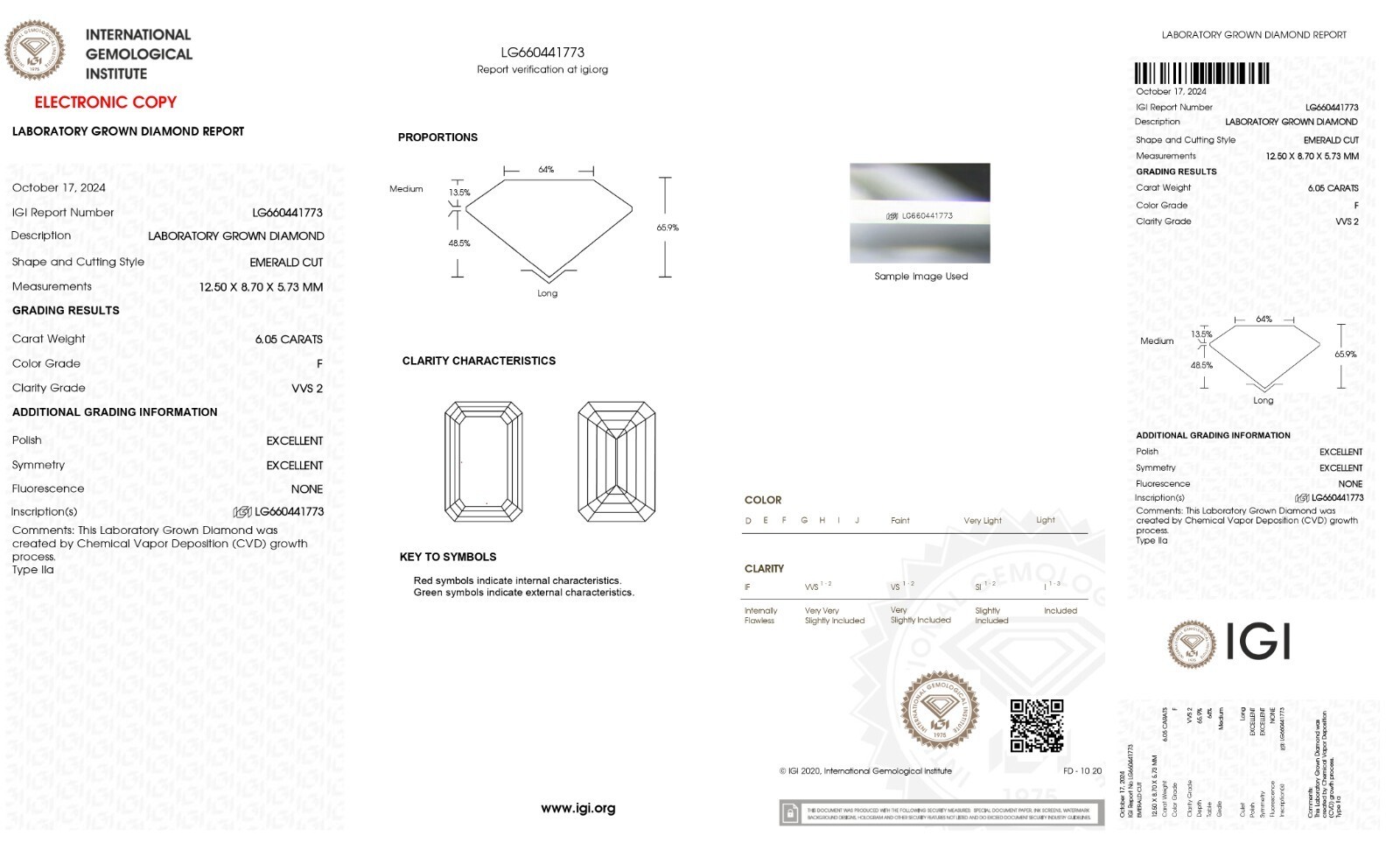 Lab Grown 6.05 Ct EMERALD Cut IGI Certified CVD Diamond F Color VVS2 Clarity