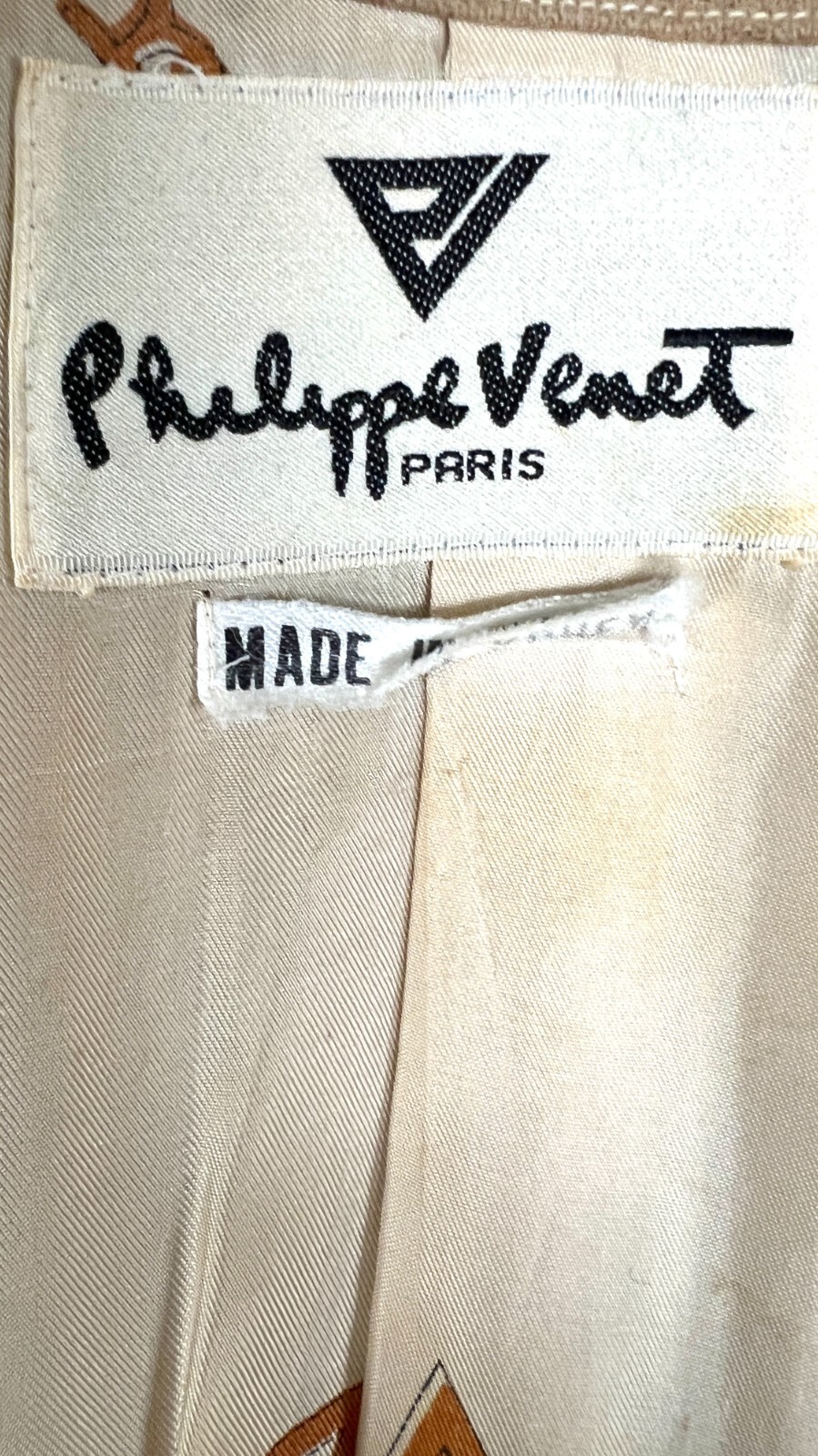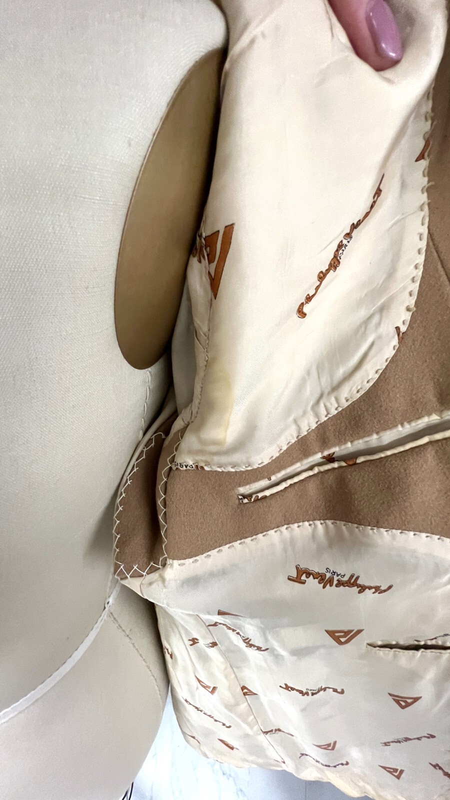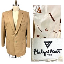 Fabulous French designer Philippe Venet Paris-70s Vintage Camel Sport Coat Blazer Men's 70s Fab Lining 44L- it is in very good condition, with no holes or stains, just had it dry cleaned- the only flaw are light underarm stains on the lining only- they don't show through. Tag inside says it is a 44L.