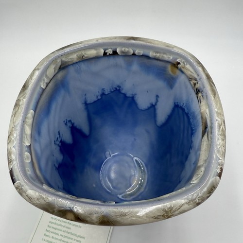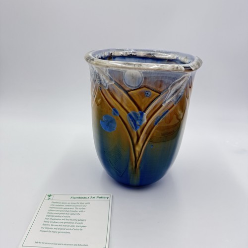 This is a Bill Campbell Studio Art Pottery vase featuring a Flambeaux Crystalline pattern in blue. It is handmade from clay and porcelain, standing 8 inches tall and 7 inches wide. The vase is signed by Campbell and bears an incised backstamp. This decorative piece is an original production made in the United States, showcasing a Studio Crafted style and Flambeaux finish.