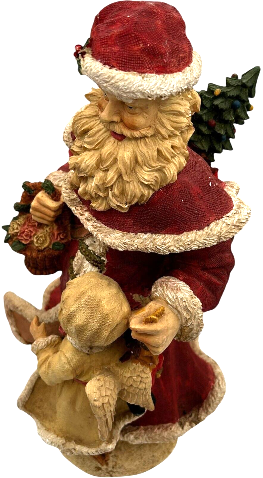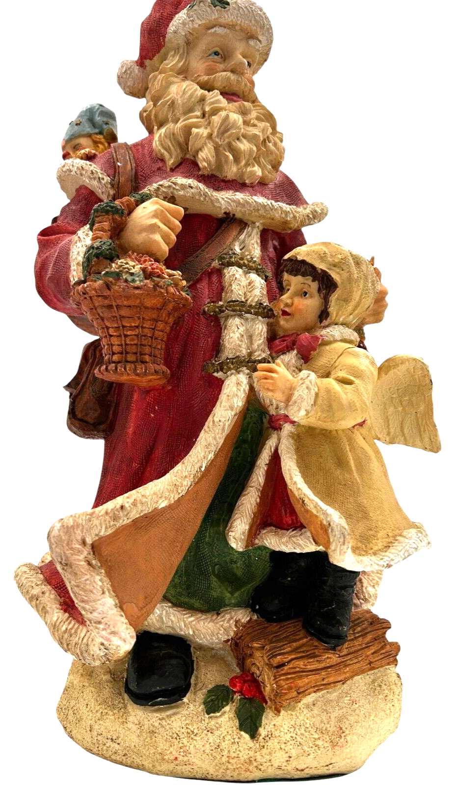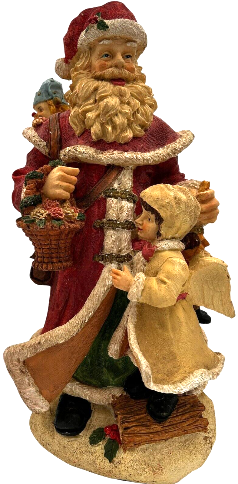 VTG St. Nicholas Santa, jacketed angel, toy bag, flowers JCPenney 15" tall resin