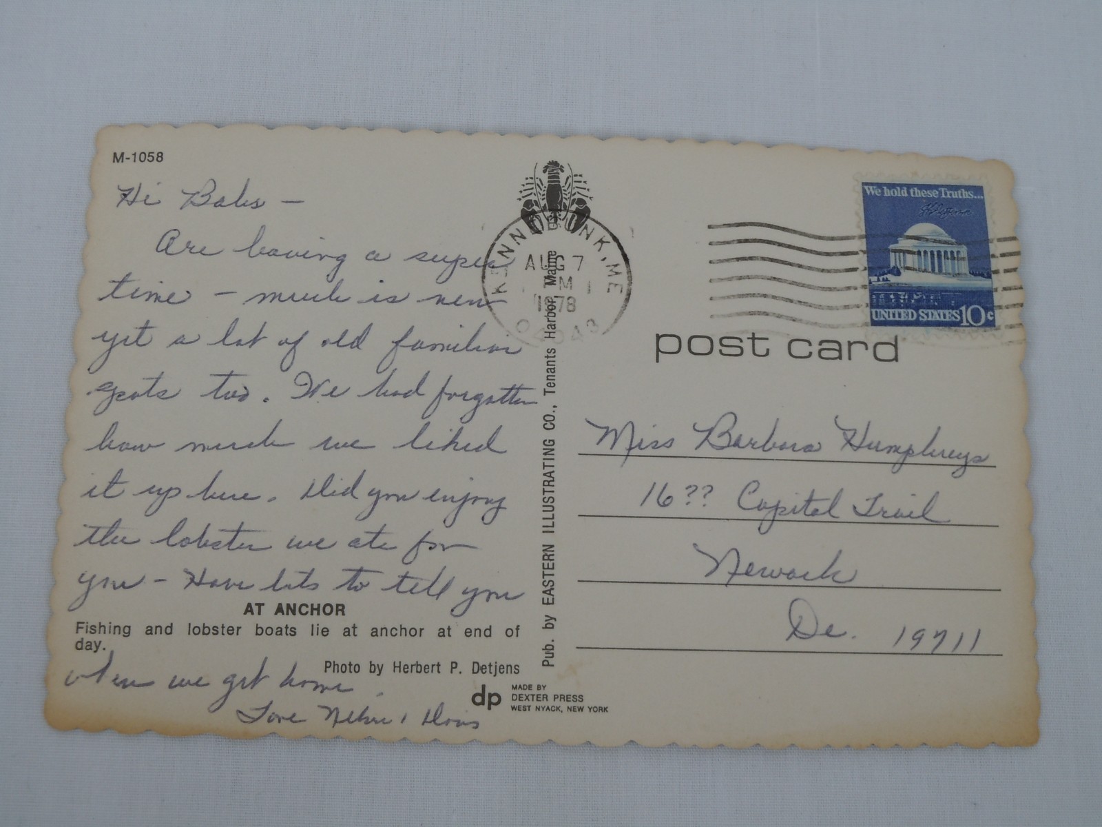 This is for a Fishing and Lobster Boats at Anchor Scalloped Edge Postcard. It is postally used. Postmarked 1978 Kennebunk, Maine.