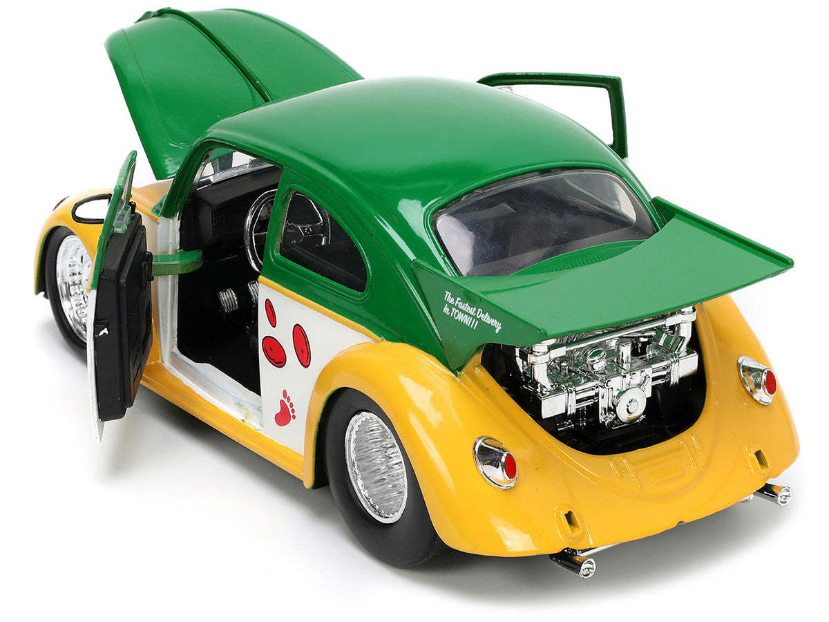 1/24 scale diecast model of the iconic 1959 Volkswagen Drag Beetle in green and yellow Includes a Michelangelo die-cast figure from Teenage Mutant Ninja Turtles Part of Jada's Hollywood Rides Series Real rubber tires for authentic detail True-to-scale detailing with a meticulously crafted interior and exterior Brand new box, ready for gifting or display