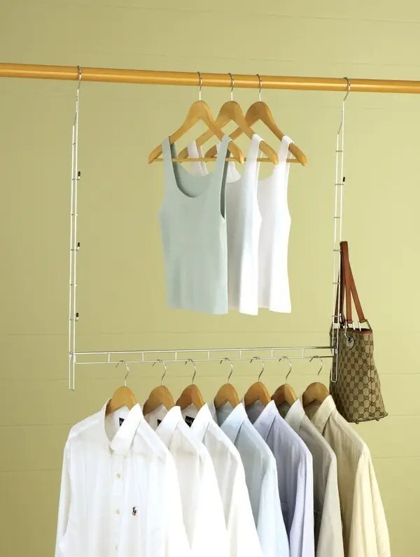 Get rid of clutter and mess in your closet while instantly doubling your closet space with this closet organizer. You are able to hang shorter items on top and longer pieces of clothing, such as jackets, coats, pants and others along the bottom. Great for dorm rooms or small apartments with limited closet storage space.
