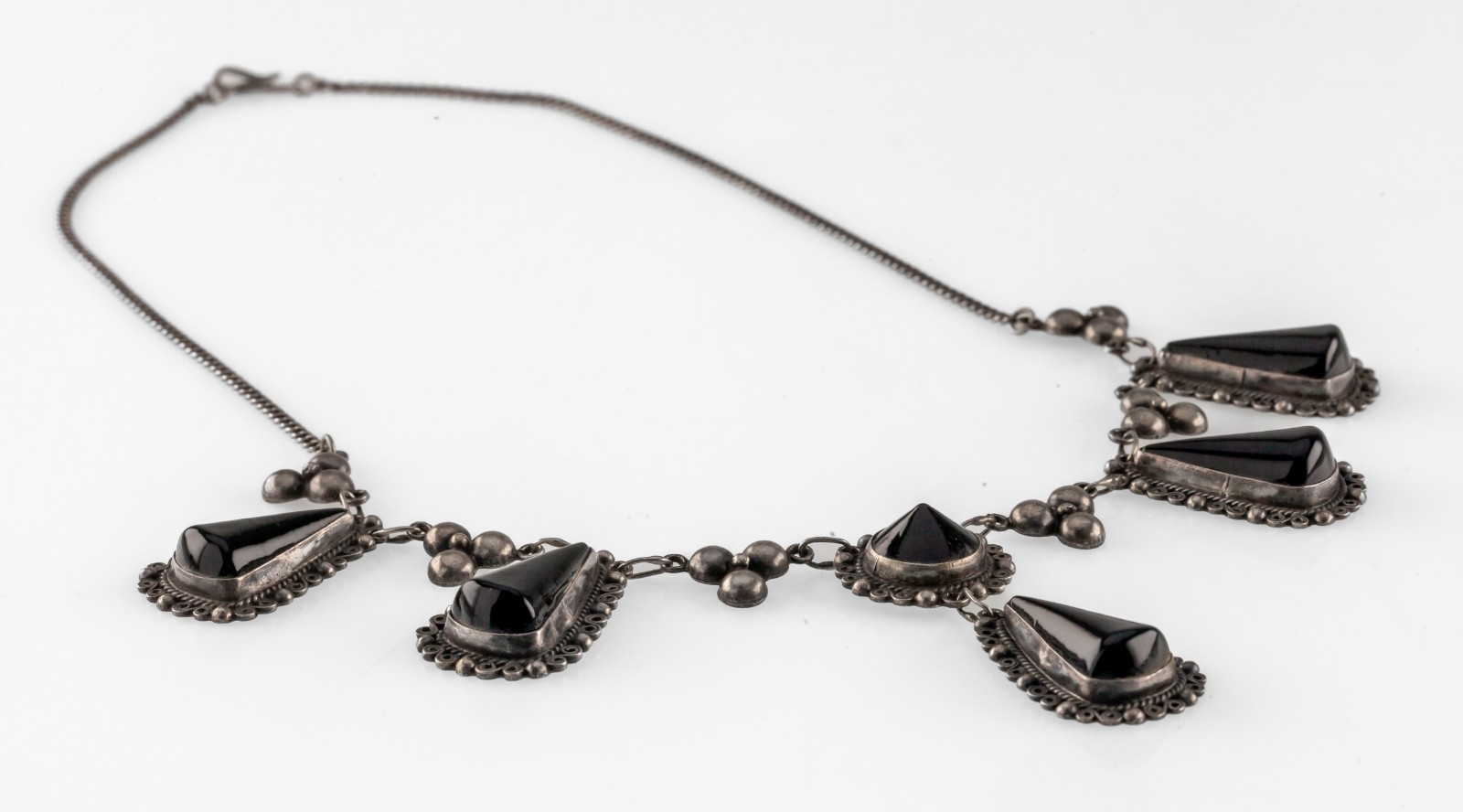 Gorgeous Sterling Silver Necklace Features Shaped Onyx in Teardrop Settings with Silver Beads in Between