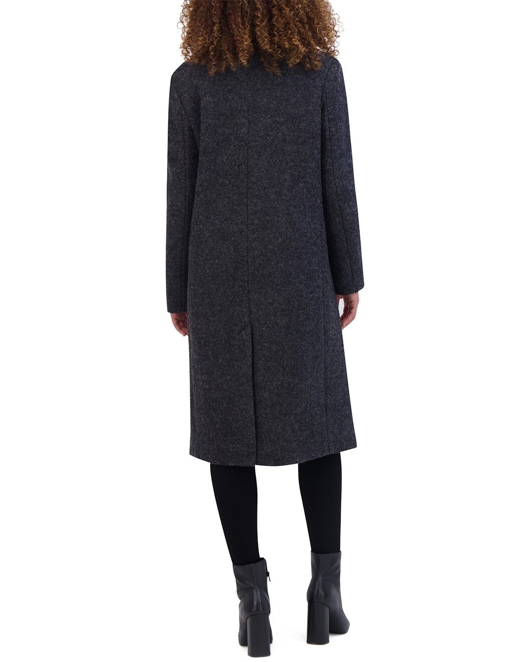 Design details: Made in a soft wool boucle shell fabric, asymmetrical zip coat, high collar with button closure for added warmth, 2 body inseam pockets with micro fiber lining, interior pocket