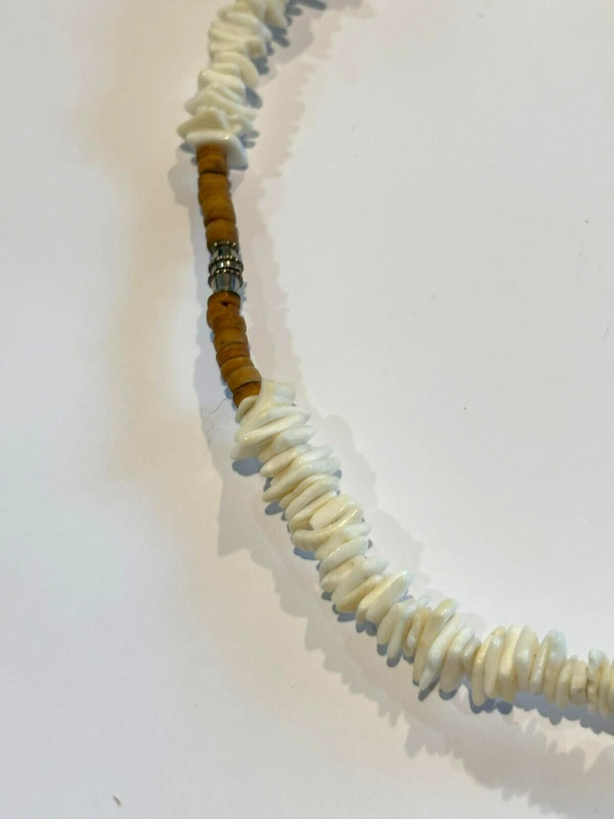 Vintage White Puka Shell Choker Necklace w/ Brown Beads โ Surfer Boho Unisex