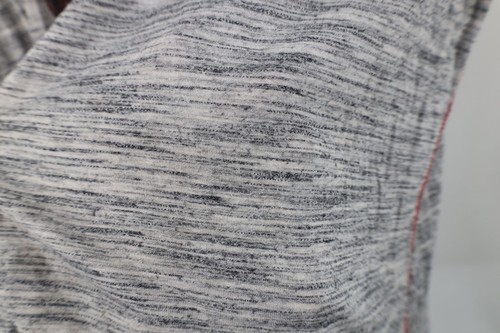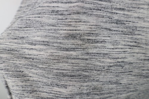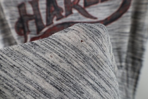 Holes, stains front bottom. Graphics faded, designs distressed. Collar, armpits discolored. Color faded. Pilling