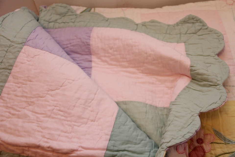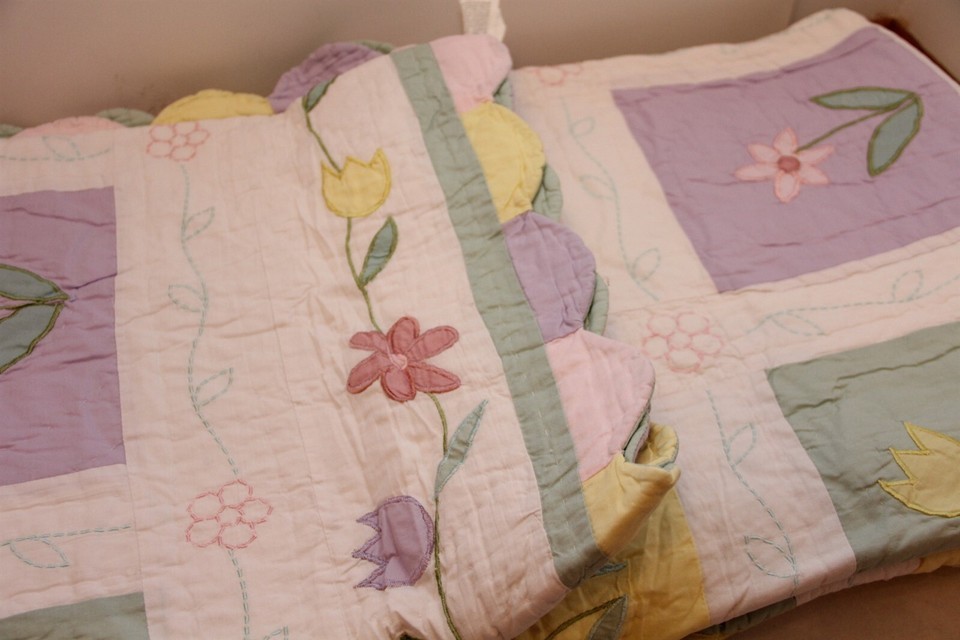 lovely floral quilt set in shades of pink, mint green, yellow, lavender and white