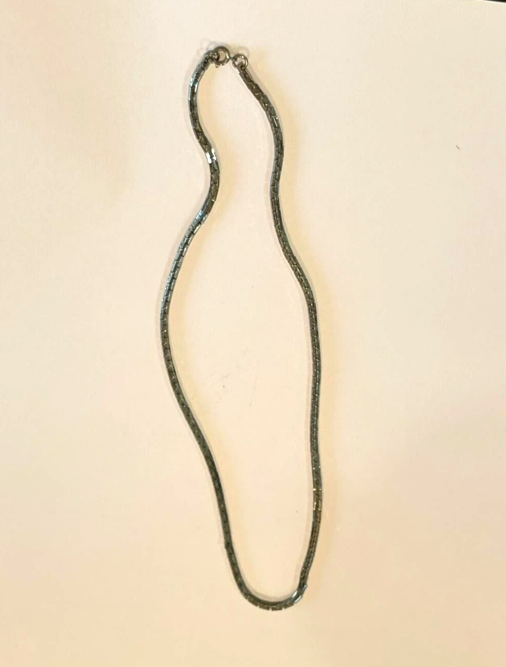 This vintage sterling silver flat snake chain necklace measures approximately 18 inches in length. It features a sleek, classic design with a secure spring ring clasp. Preowned but in excellent condition with minimal signs of wear. Perfect for wearing alone as a statement piece or pairing with a pendant.