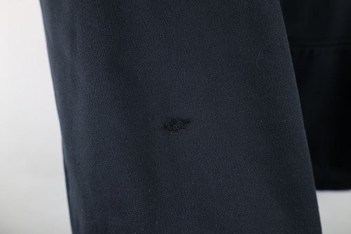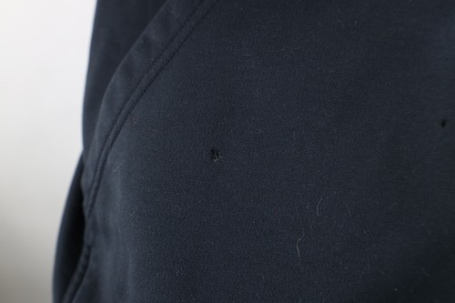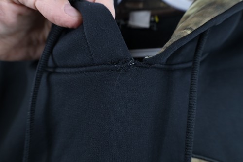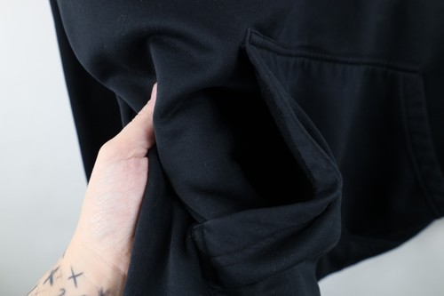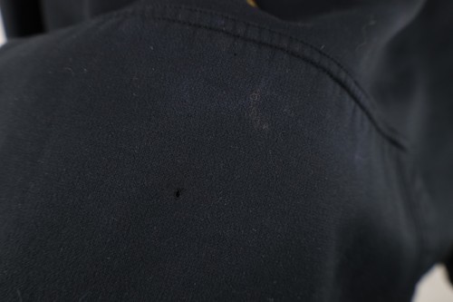 Mended hole on the front neck. Holes front, pocket, right arm. Farbis pulls. Bleach stain front. Blemishes/dark spots throughout. Front of hood loose, string distressed. Hood, cuffs discolored. Design distressed. Color faded