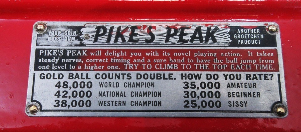 The object of the game is to get as many of the five balls as far up Pike?s Peak as possible. Balls are loaded one at a time once a penny is inserted. The knob on the front of the machine alternately raises and lowers the green and blue sections, moving the ball further up the hill. Unless of course you allow it to slip out one of the side chutes before reaching the top. The higher you can get the ball, the higher the score. Scoring is determined by adding up the values shown in the windows to the left and right of the instruction card. A gumball was also dispensed on each play of the machine from the small door on the lower left. The gold ball counts as double score