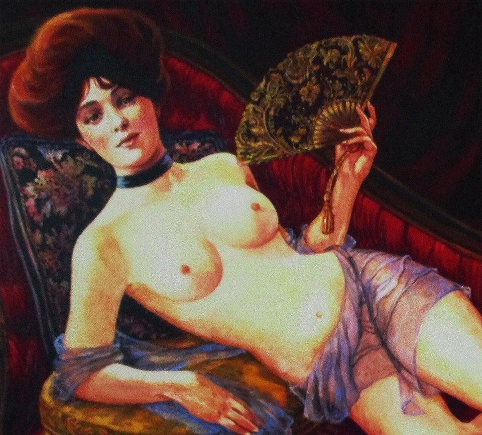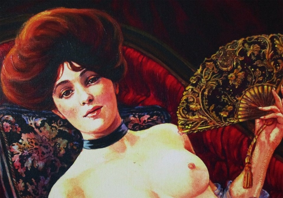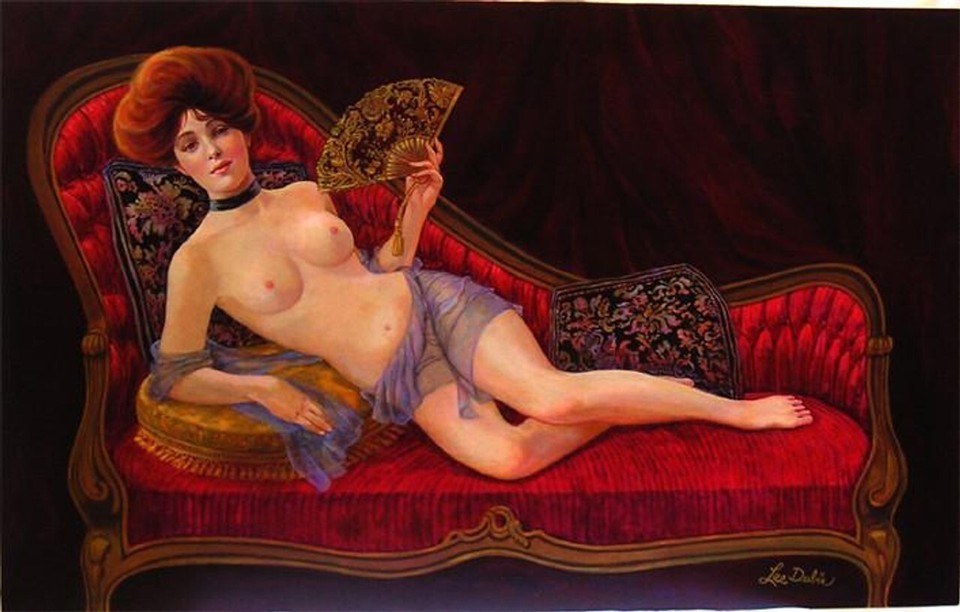 The story behind this painting is most incredible. Lee Dubin has a firm belief in reincarnation. She has memories of several of her past lives including a San Francisco Madam. When she is painting, she must be totally alone and will enter into a trance of complete concentration. While painting the subjects in the paintings will converse with Lee. In this particular example the young lady, Evelyn Nesbit, argued with Lee concerning the upholstery of the sette. The original pencil sketch and first painting in the brown sepias was gold embroidery. Evelyn demanded red crush valor. Due to the challenges voiced by the subject "Evelyn" Lee never completed the initial painting and restarted with a red crush valor sette.
