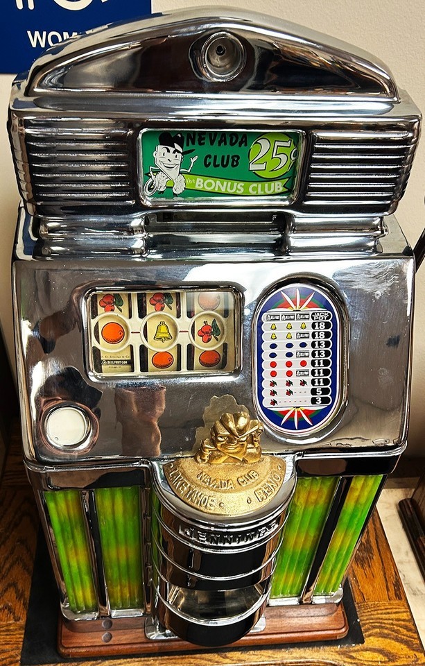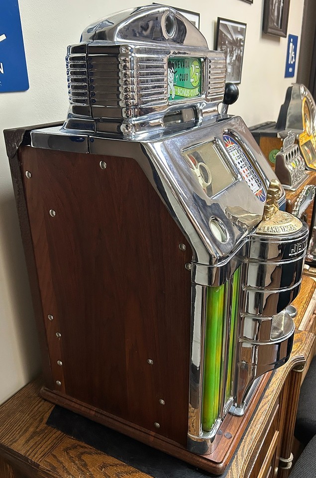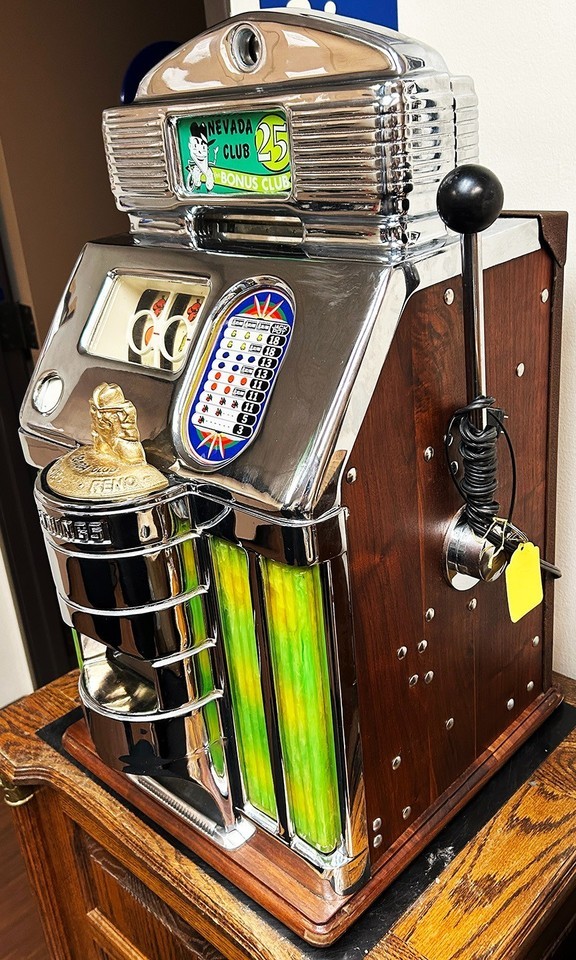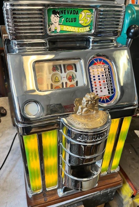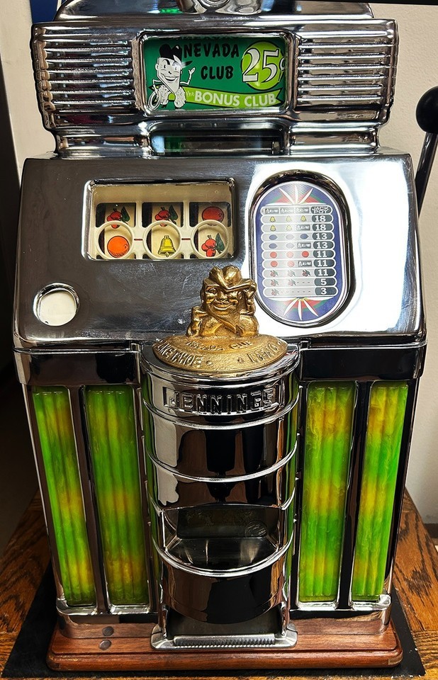 A fully restored Jennings 25c Nevada Club featuring professional rechromed metal, rare green bakelite lens, brass Reno Nevada Miner above the jackpot, refinished walnut cabinet, original keys