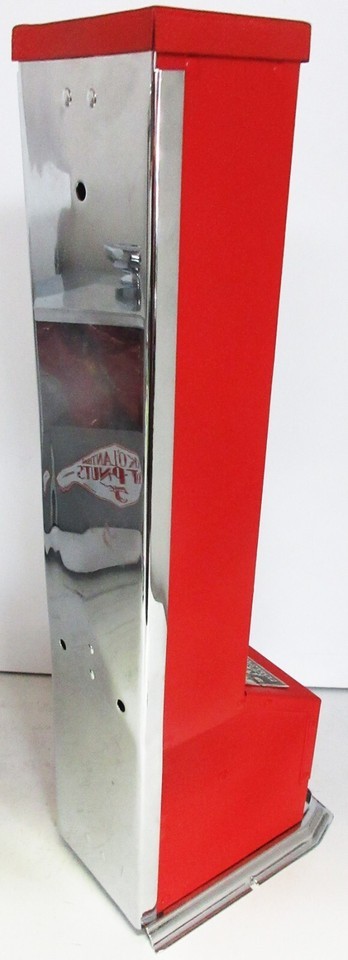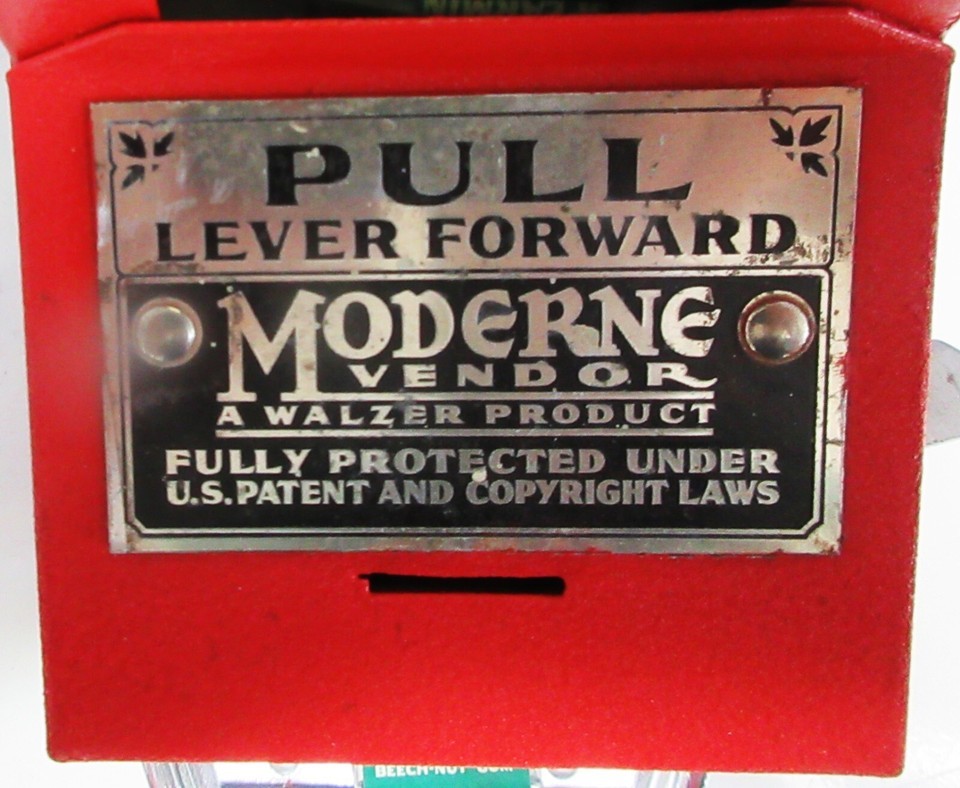 The Moderne Vendor 1c Spearmint Waltzer Gum Dispenser is a unique vending machine that dispenses candy, specifically spearmint waltzer gum. This original collectible piece was made in the United States and is categorized as a vintage candy item. Perfect for collectors of vending machine memorabilia or those looking for a nostalgic piece of American confectionery history, this gum dispenser offers a piece of sweet nostalgia in a modern design.
