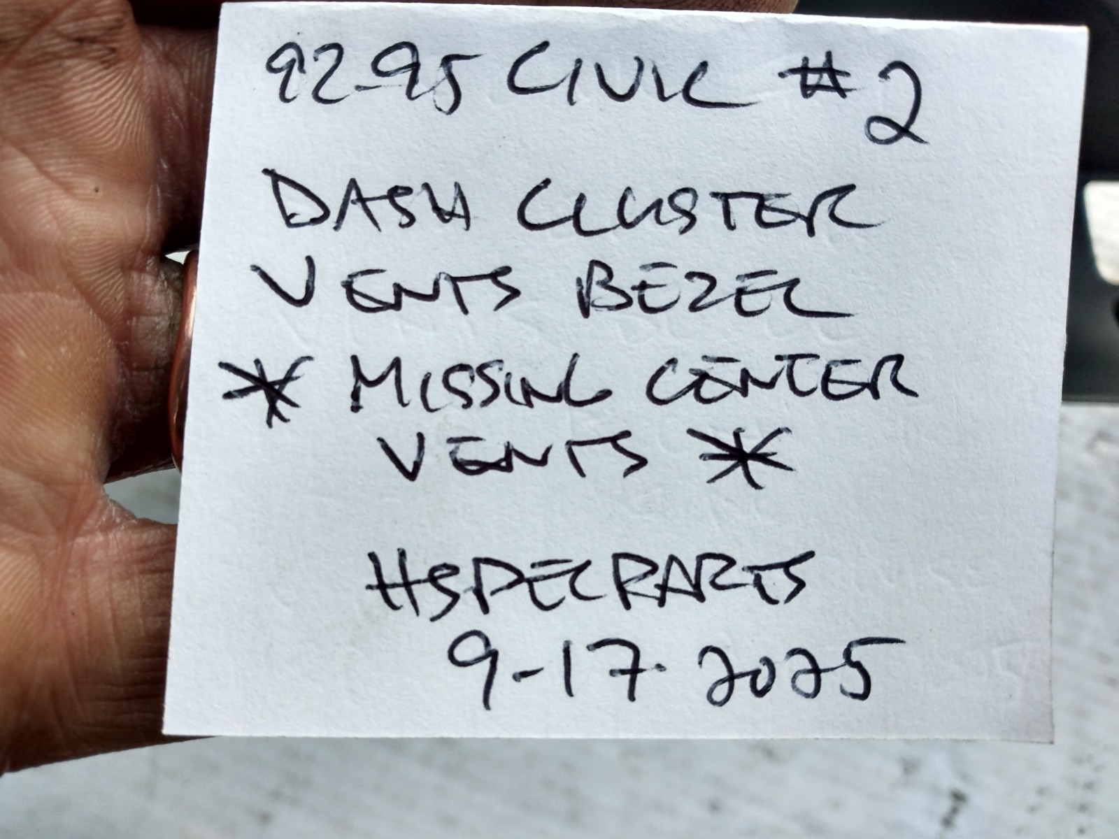 GOOD USED CONDITION. CLEAN BEZEL FROM A 92 CIVIC DX HATCHBACK. MISSING CENTER VENTS. TAB MOUNT BEHIND HAZARD IS BROKEN. CAME OUT OF DONOR THIS WAY. SHIPS USPS WITHIN A BUSINESS DAY OF PAYMENT.