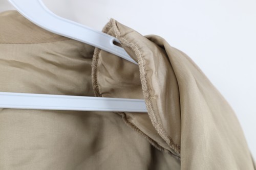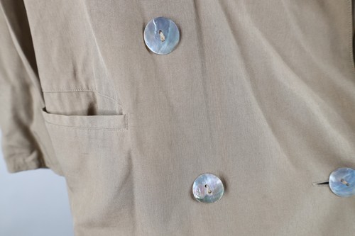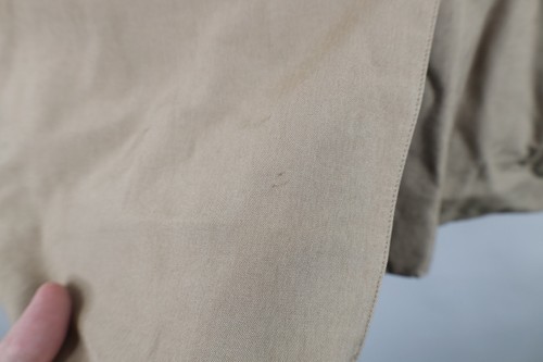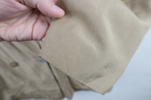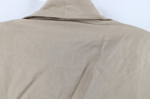 Blemished/distressed buttons. Stains/blemishes front, blemishes back. Fabric pulls left arm. Collar, cuffs, inner lining discolored. Color faded. Has shoulder pads. Loose threads inner bottom hem