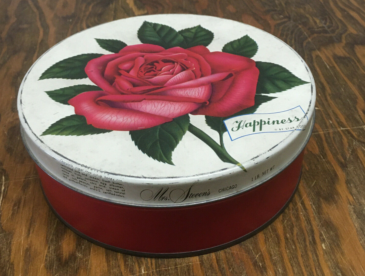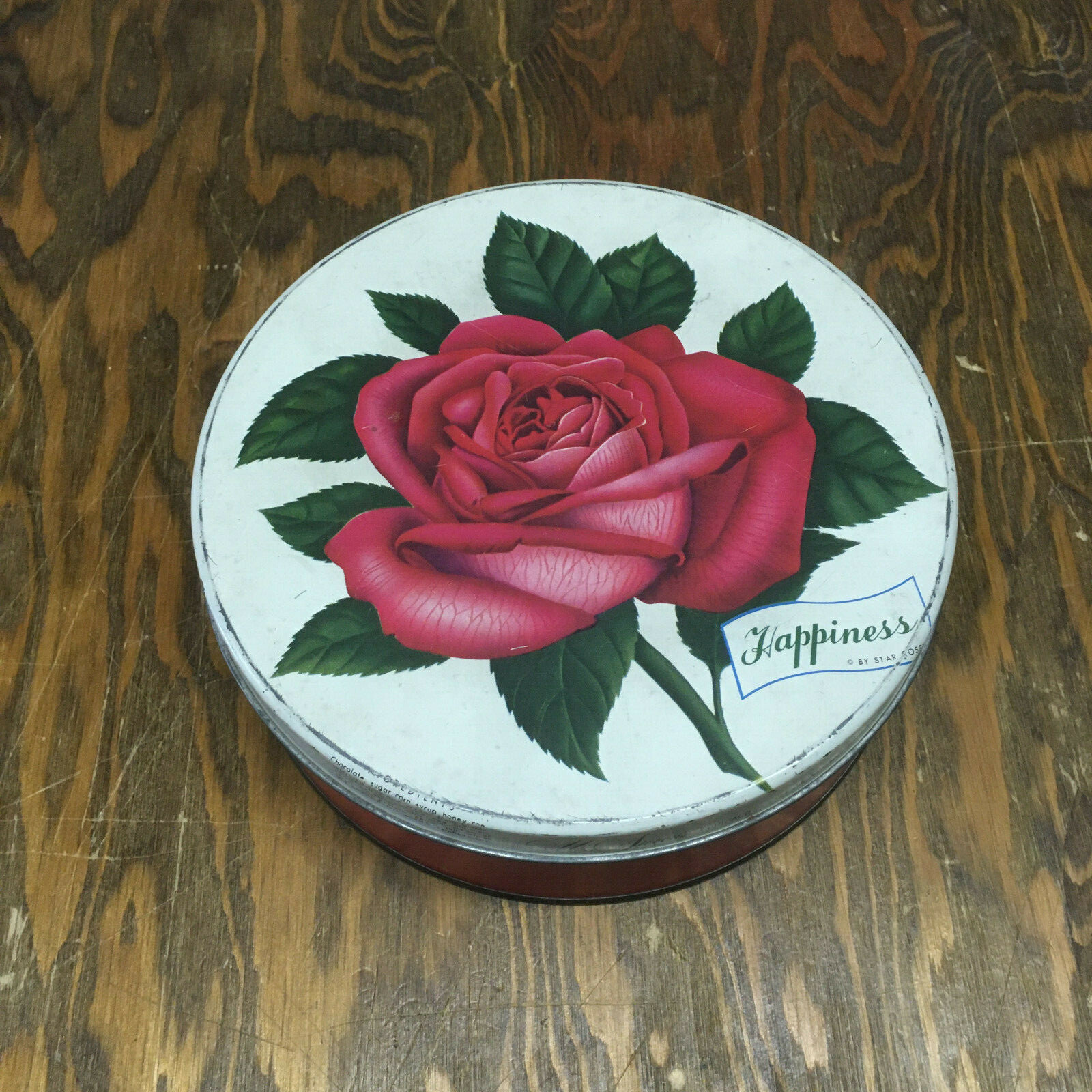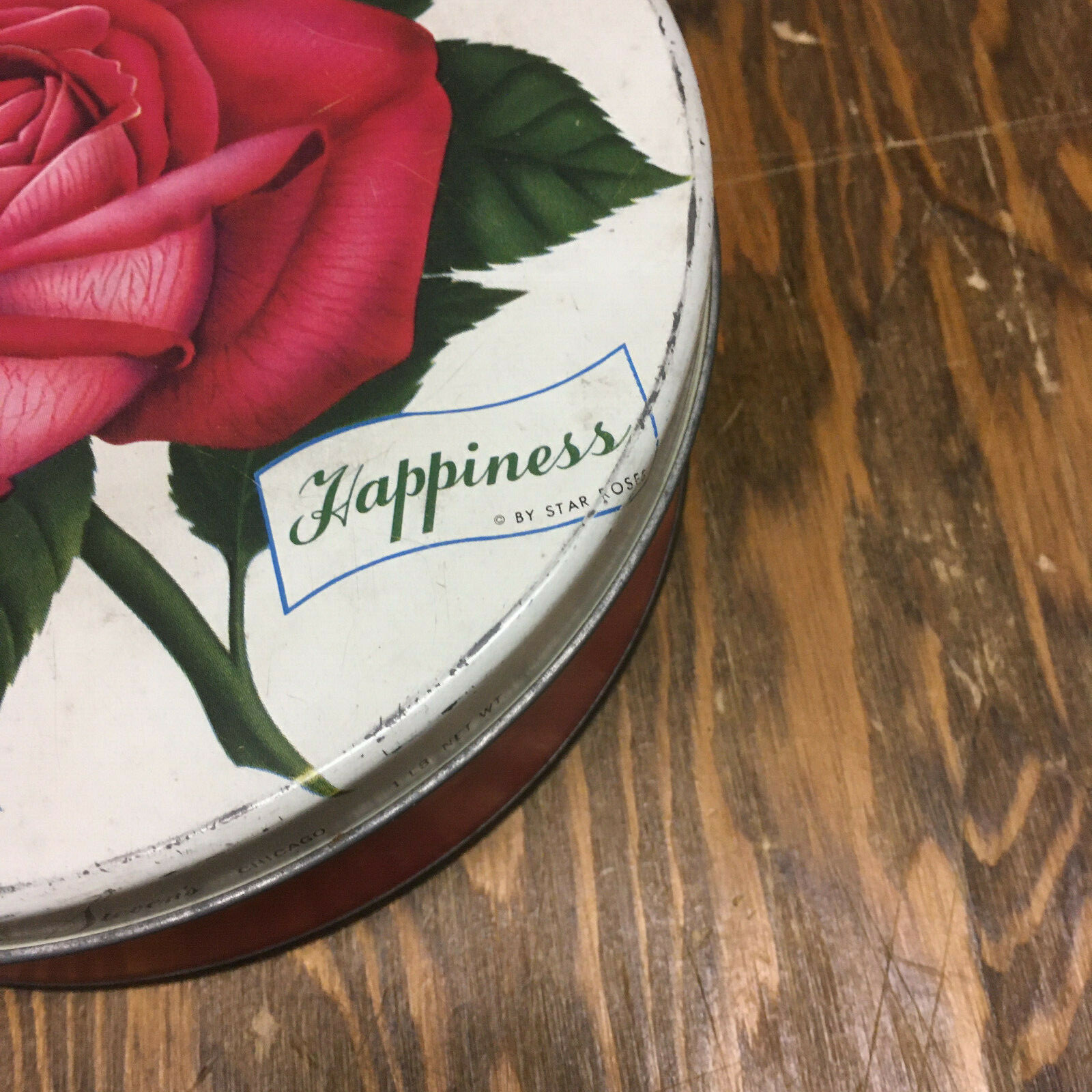 Vintage empty round tin with rose lid happiness by star roses Mrs. Steven's