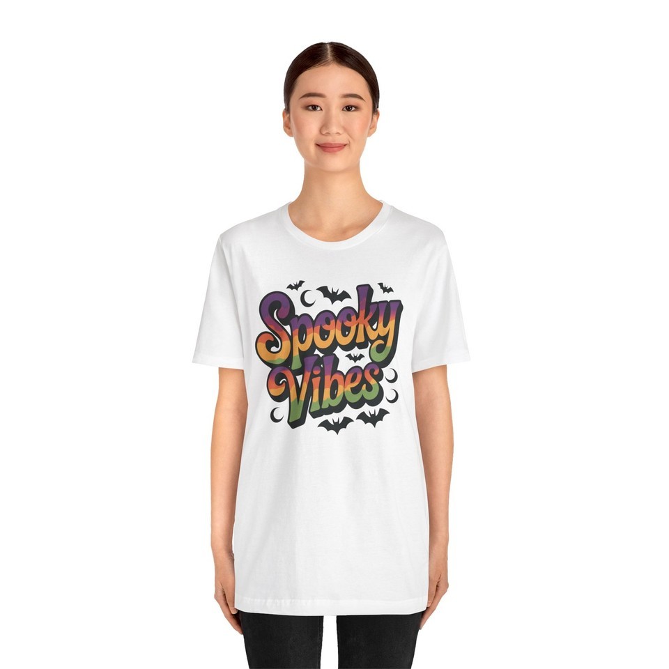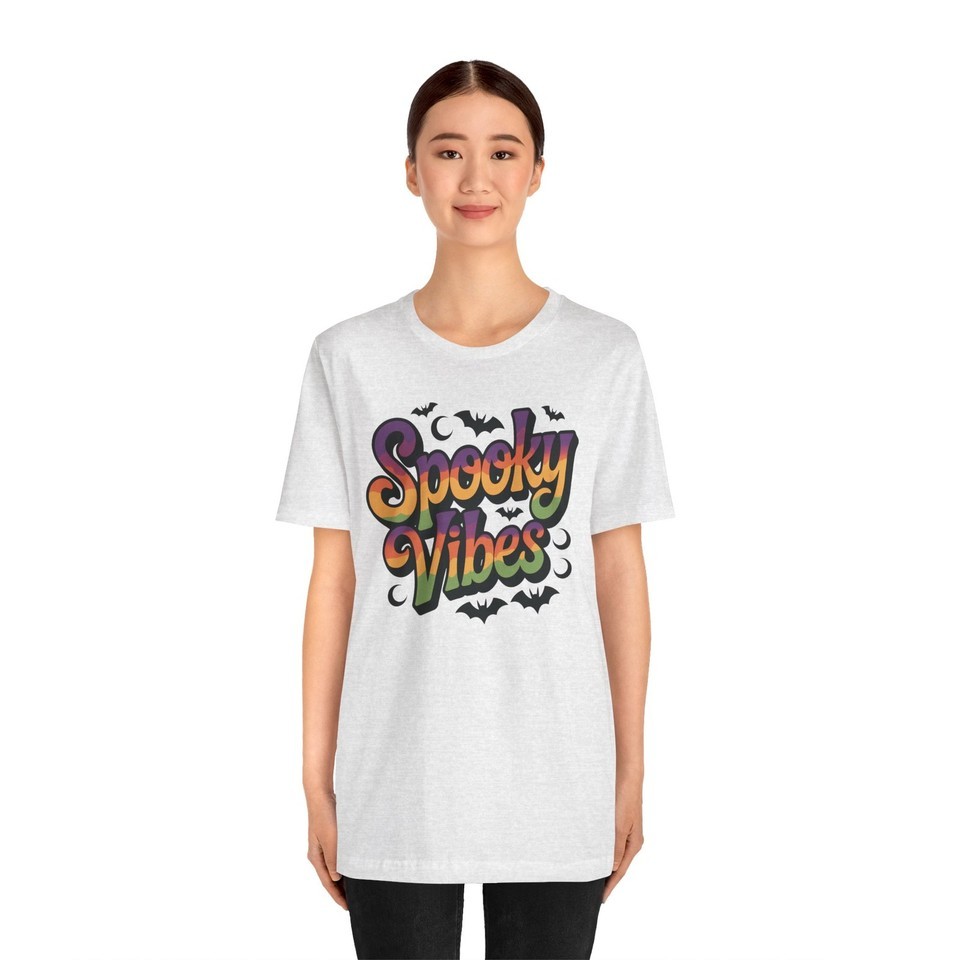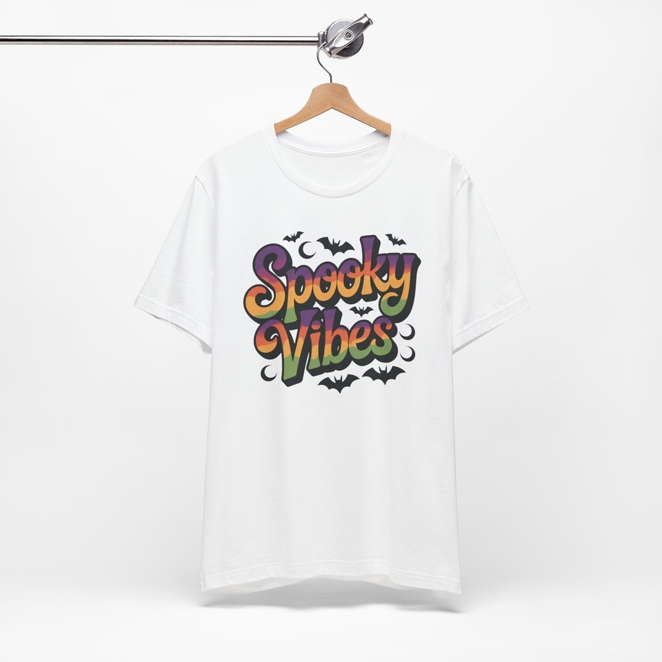 Get ready to embrace the spirit of the season with this stylish Unisex Jersey Short Sleeve Tee, featuring a fun and colorful "Spooky Vibes" design. Perfect for Halloween enthusiasts, this tee captures the playful and festive atmosphere of autumn festivities. Whether you're attending a party, trick-or-treating, or simply enjoying a cozy night in, this shirt brings an element of excitement to your wardrobe. Ideal for casual outings or lounging at home, it?s designed to fit effortlessly into your lifestyle. A perfect gift for friends, family, or yourself during Halloween and other fall celebrations!