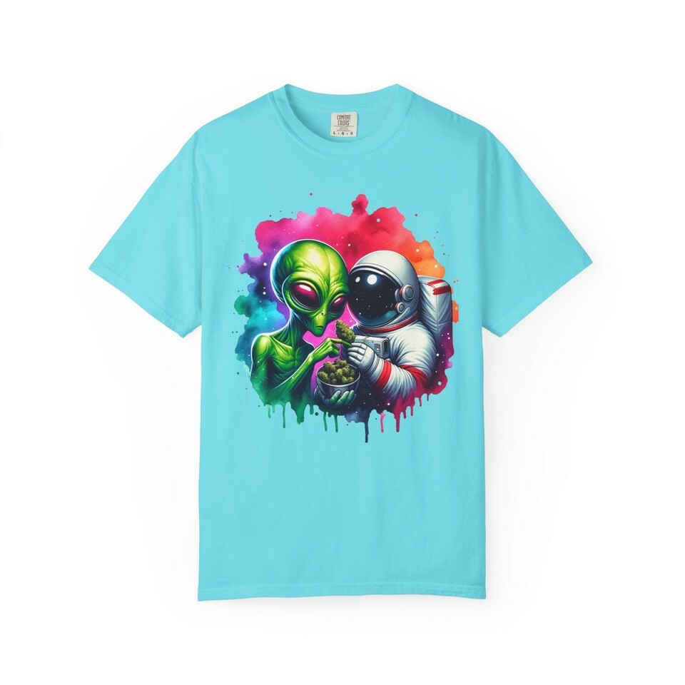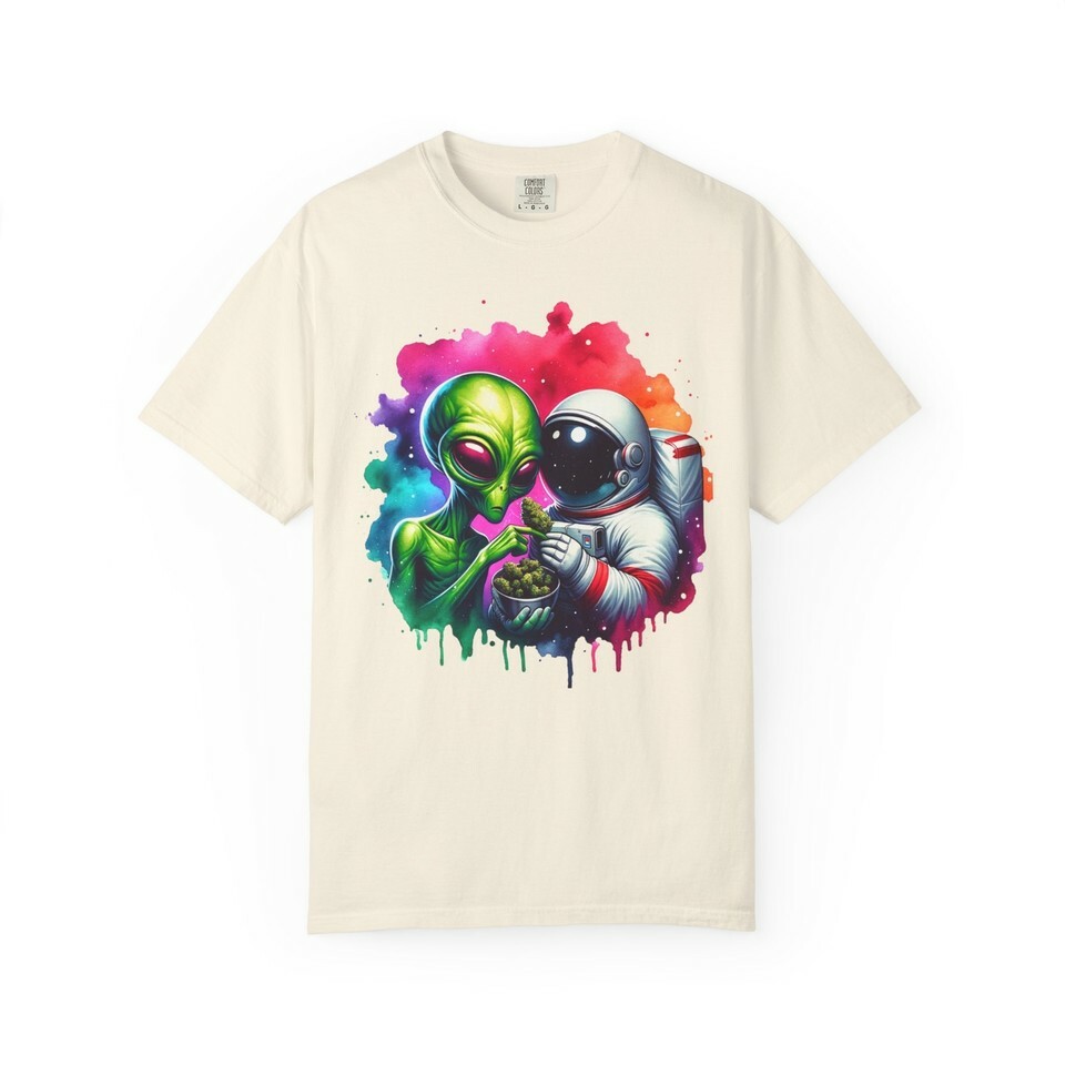 Alien and Astronaut Smoking Watercolor T-Shirt, Vibrant Unisex Space Lovers Gift