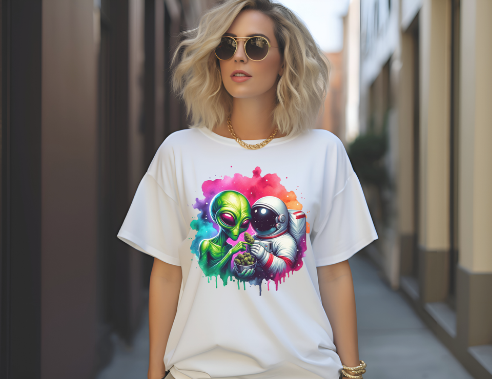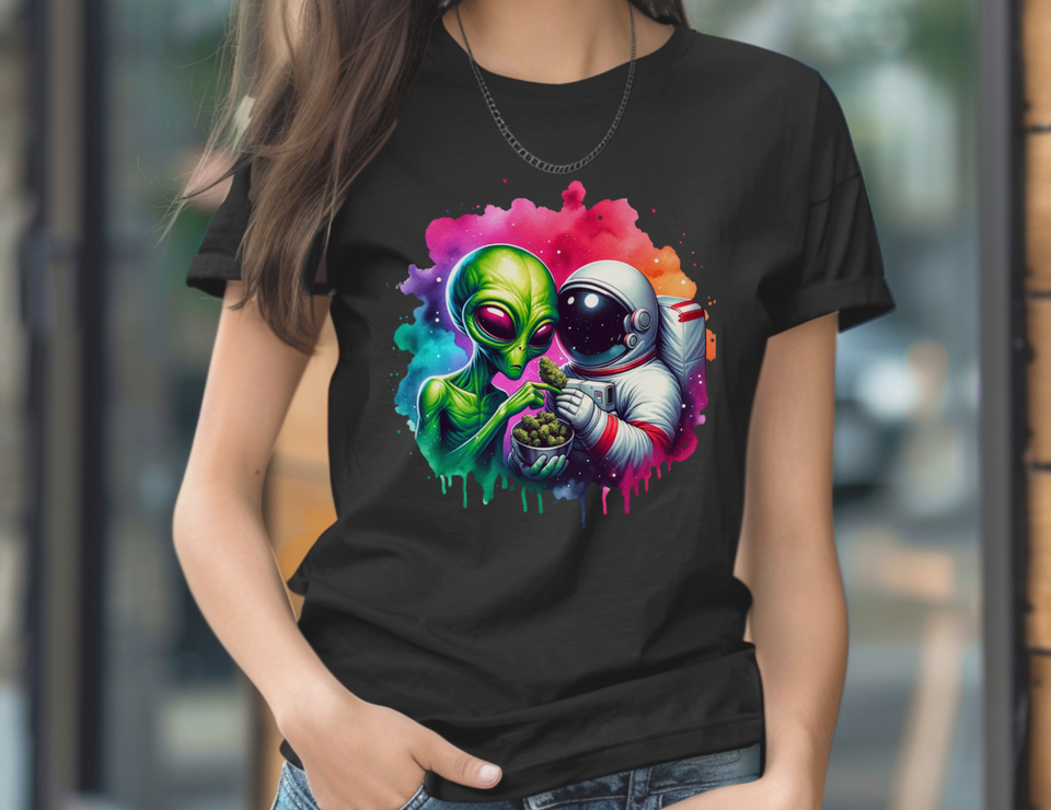 Dive into the cosmic harmony of our watercolor design featuring an astronaut and an alien sharing a moment of intergalactic camaraderie. In this whimsical scene, the astronaut extends a bowl of cannabis, symbolizing peace and friendship, while the curious alien reaches out to accept the offering. Rendered in vibrant watercolors, this design captures the playful exchange between two beings from different worlds, united by a shared sense of curiosity and connection. Add a touch of cosmic charm to your space with this delightful depiction of interstellar friendship.